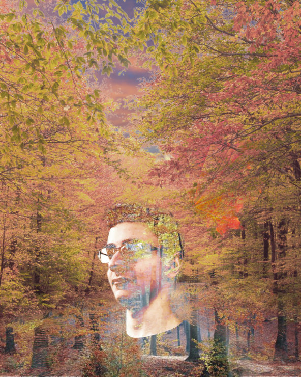 For my self portrait I took a picture of myself and used the double exposure techniques to overlay a fall background under me because I would much rather be in fall weather than in this cold winter. I then stitched another fall scene on top of that to be top part of the picture and put a new sky into the picture along with a big leaf as a symbol of fall.