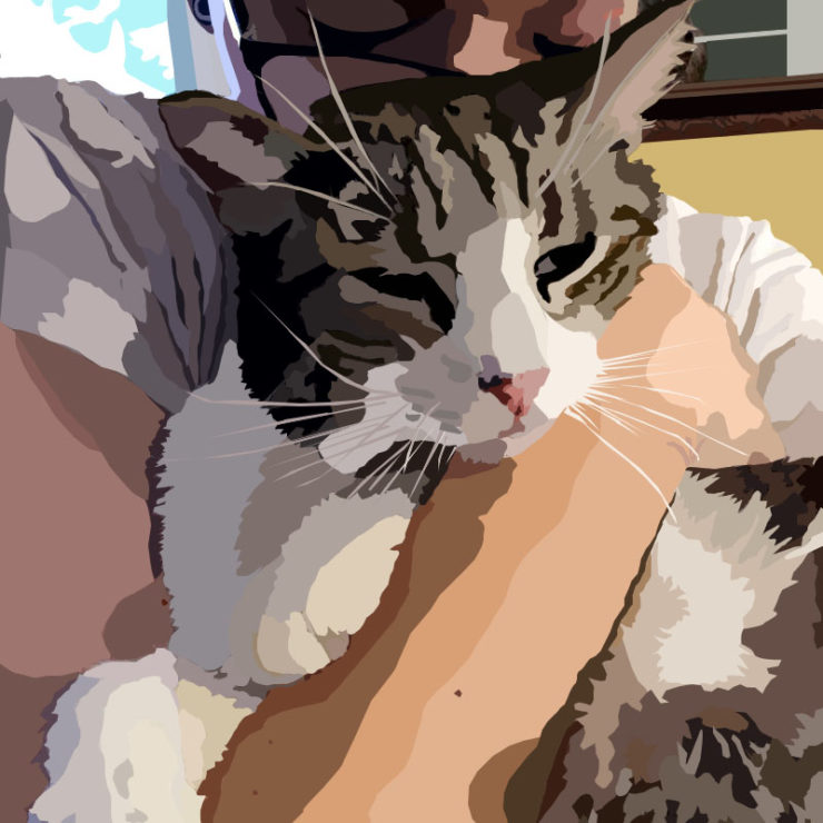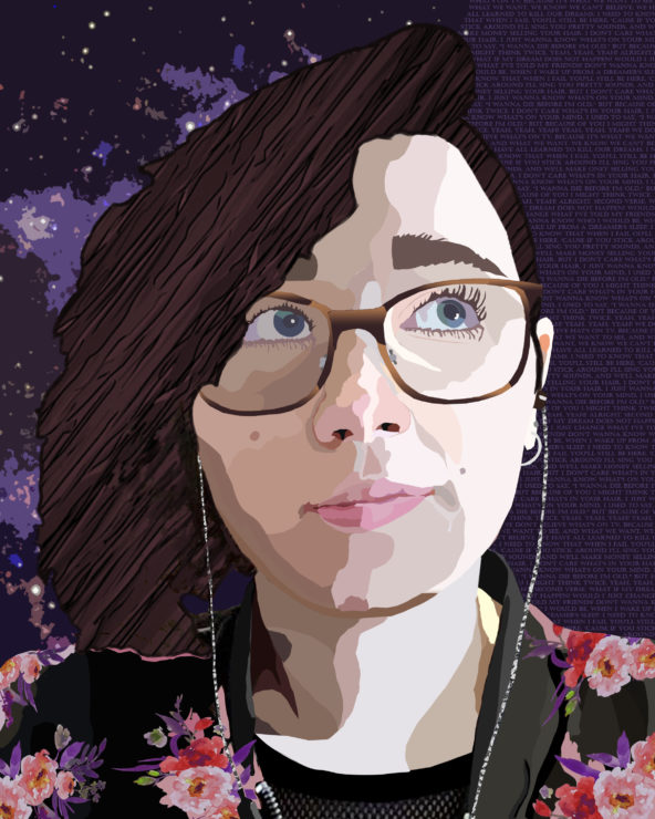 For my self portrait, I started with an image of myself, then I vectored my whole face and neck. I chose vectoring because I like the style, I think it gives it a great sort of lifelike but simplistic image. By chance, the original lighting kept one half of my face lighter and the other darker, which I really liked because the split lines up with my hair part, which I utilized in the background. For the background, I decided to chose two things that make me think, that being space and music. The division of the background is dictated by the parting of my hair, with a galaxy on the long side, and words on the short. I pulled the image of the galaxy from NASA and used Photoshop filters to make it more simplistic, and fit with the vector style. The lyrics on the right side are from “We Don’t Believe What’s on TV” by twenty one pilots. I’m not the biggest twenty one pilots fan out there, but I’ve always really liked the lyrics to this song, which describe concerns about the failure /changing of our dreams and the support and love of those you care about (If you’re interested you can view the lyrics here: https://genius.com/Twenty-one-pilots-we-dont-believe-whats-on-tv-lyrics). For my hair, I sampled a drawing of the texture of wood. This is just a visual I really like, but my childhood home, that my family no longer owns, had a lot of wood in it, and I always loved the patterns as a kid. I was really interested in how the texture could be used here to mimic that of hair. For this I adjusted the hue and saturation of the wood to give it a brown purple tint (brown for my hair, purple for the image theme (also my favorite color)), then I created a clipping mask to encompass my hair. Finally I vectored the jacket I’m wearing, and placed a sampled and altered image of vintage flowers on the jacket. I changed the coloration of the flowers and used a filter to adjust them to fit the theme I set for the photo. Then I overlaid it on the jacket. I chose flowers because anyone who knows me knows I wear way to much floral, and I liked how it added to the bottom half of the image.