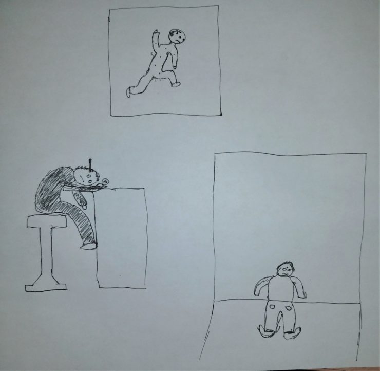All three characters will be the dead Russian gangsters that John Wick killed with a pencil. The top is a birds eye view of victim dead on the floor, face to down or to the side. The bottom left is victim killed on the bar stool still with the pencil in his head which is leaning on the bar table. The bottom right is the victim dead against the wall who wrote baba yaga out of his blood.