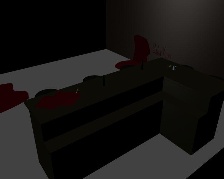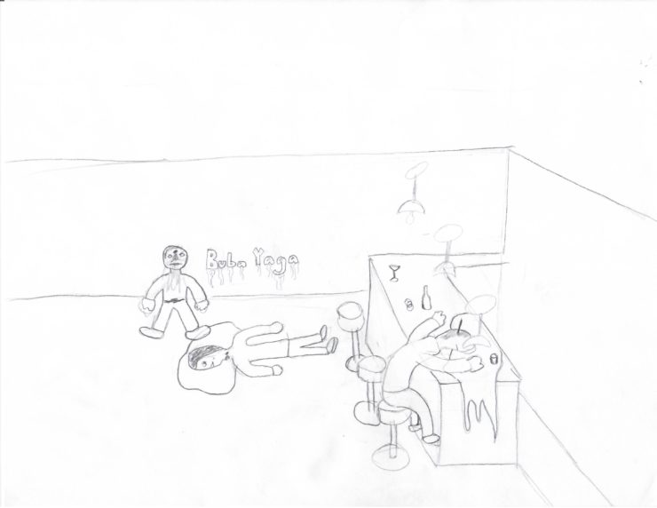 To make sure this scene is easily noticeable, certain objects or references from movie will be placed around. Next to one of the bodies on the ground will say “Baba Yaga” written out of blood. As said above, Baba Yaga was John Wicks nickname and means Boogeyman in Russian. Another object will the pencil which will be protruding from the head of the guy leaning on the bar. The last object will be one or more gold coins on the counter which is what John Wick and other characters in the movie use as pay and currency. The coins could either be paying for the drinks or the clean up as seen earlier in the movie.