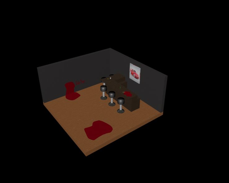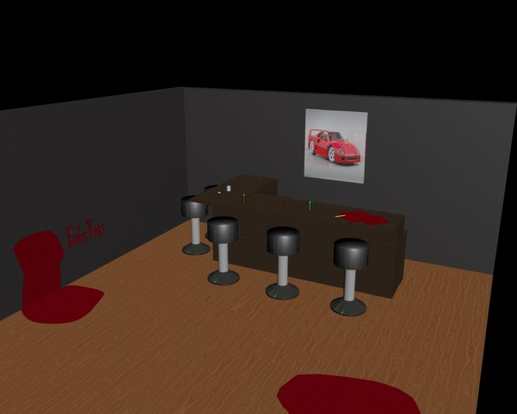 For the Bar table, I created a dark wood pattern with almost black rings. I changed the stool legs to a silver gloss as well as added a leather texture to the seat part to make it look like an actual stool. For the floor I went for a lighter grain of wood to contrast the rest of the scene. I also changed which types of color blinn, phong etc on the glasses to make them reflect more realistically. The hardest part was definitely trying to make the wood pattern realistic and took a while messing around with the settings to make it look right.