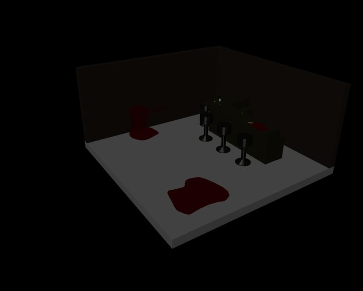 My scene will take place in a dim lit older bar. The bar table will be a “L” shape made out of thick dark wood with lights hanging from the ceiling. Three bodies will be spread around the bar: the first, still sitting on the stool with their chest and head face down on the table, maybe with a pencil sticking out of their head and the second and third will be somewhere on the ground.