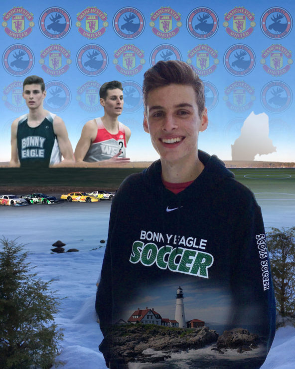 For my self-portrait collage I incorporated many of the things that I am passionate about including running track, playing soccer, watching racing, and enjoying the great state of Maine! I tried to incorporate the images to create a collage-like effect, however, I did want to make sure the images blended into one another to create a united work. I started with the picture of myself with Sebago Lake, Maine in the background. Running being very important to me, I added two images of myself running track, one from high school and one from here in college. I then focused on my love for soccer were I created a pattern of my favorite professional soccer team’s emblem, Manchester United, and the premier soccer team that I played for Rosevelt Soccer Club. Even further, not only am I wearing my high school soccer sweatshirt in the photo, but there is also a field somewhat hidden on the right horizon line. The race cars on the left have come from a track called Beach Ridge that’s very close to my house, somewhere I would always go when I was younger. I finally tied the piece back together with the allusions to Maine. In my sweatshirt, I added a picture of Portland Headlight which is iconic to Maine and is also very close to a cottage that my family and I stay at almost every summer. The silhouette of the State of Maine is shown in the background because although I’m away at college it is still very close to me.