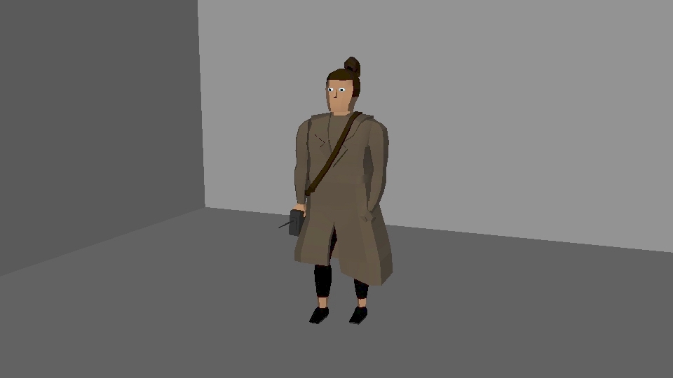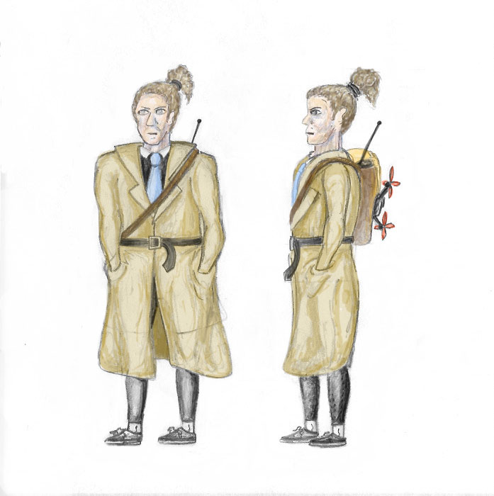 My concept character is detective Jim Kahn and including a front view and side view of the detective. As an unexperienced but clever detective, Kahn uses his knowledge of drone flying to observe crime scenes. While it might be concealed under his trench coat, Kahn is surprisingly fit and agile, and ready for anything!