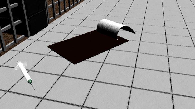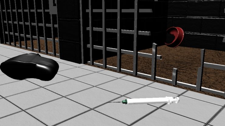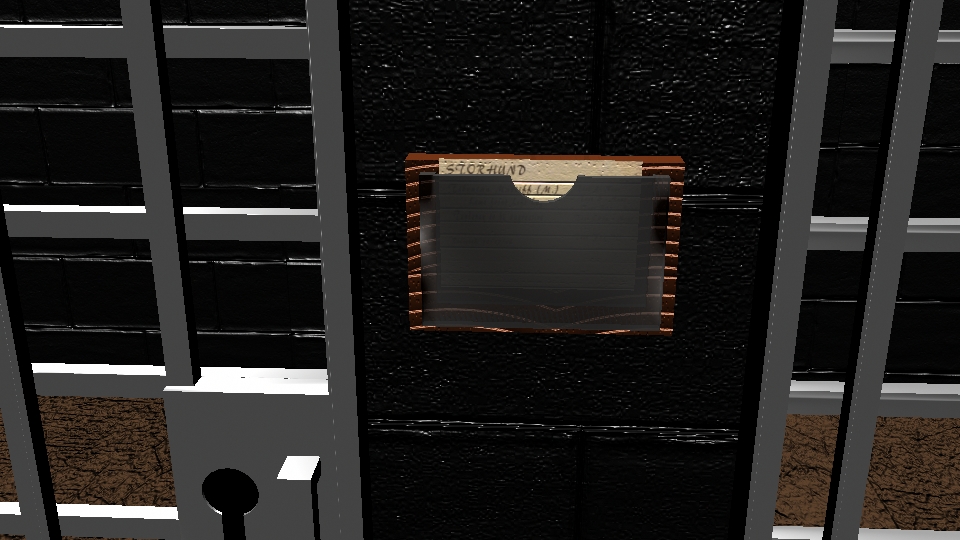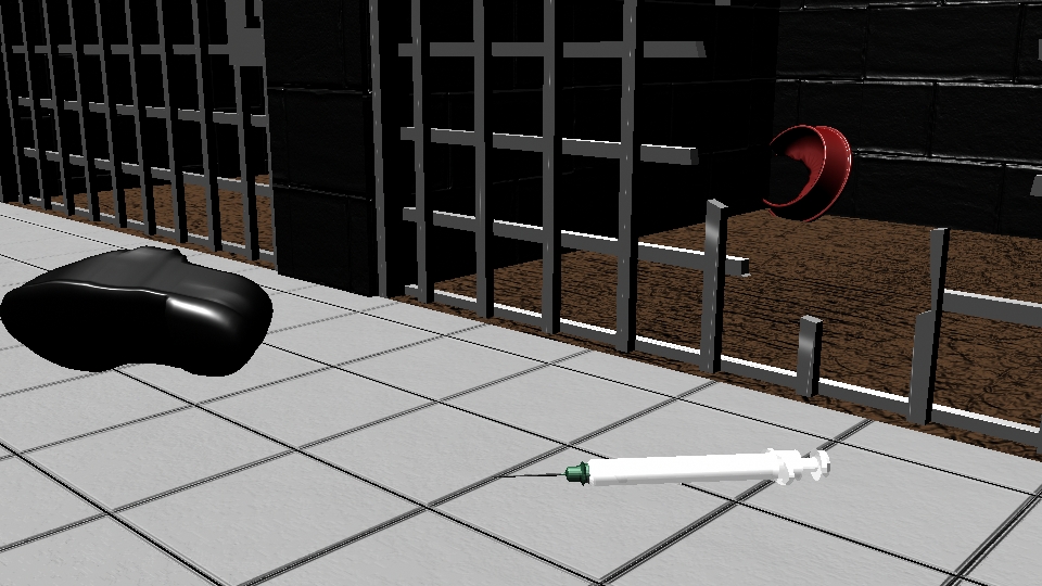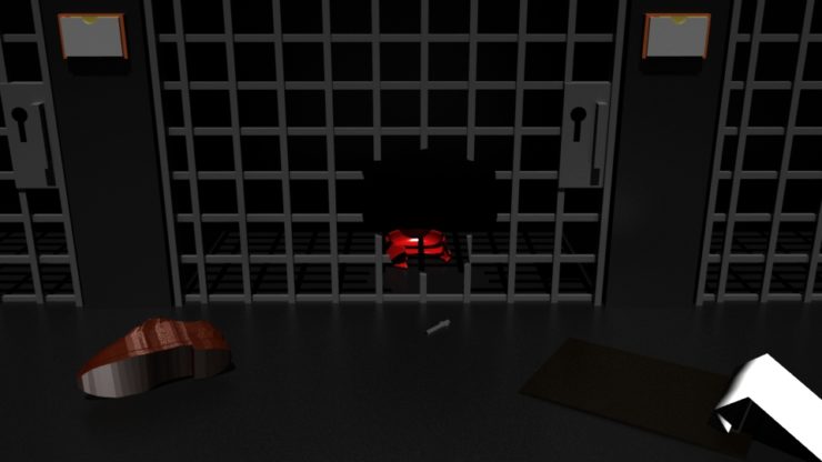 Here’s my first pass at creating the dog pound breakout scene I described in my last post. It’s definitely not perfect and going forward, I look to smooth out the paper on the clipboard, refine the shoe, and redefine the bite taken out of the bowl in the cage. Additionally, I’m looking to put more appropriate textures on the objects, instead of just basic colors.