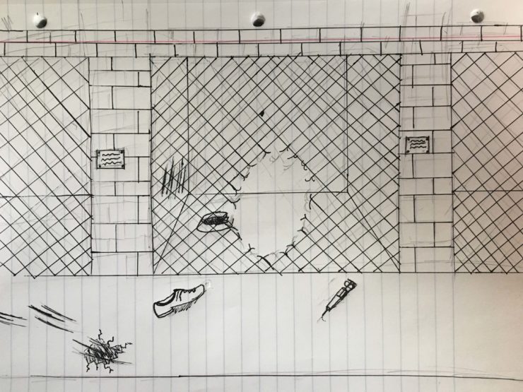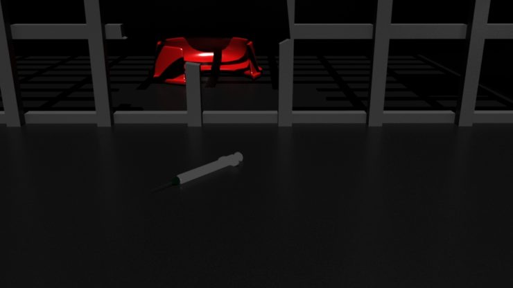 Speurder looked inside the cage and saw the same as every other cell: the piss stains, matted down hair, and a dried blood. What really caught his eye was the giant bite taken out of the bowl. This dog was definitely not all bark. Looking outside of the cell, he noticed a lone leather shoe, tipped on its side. It was black and seemed to be the type worn by those who wanted to seem more professional than they actually were. Next to the shoe, he spotted what looked like an empty syringe.