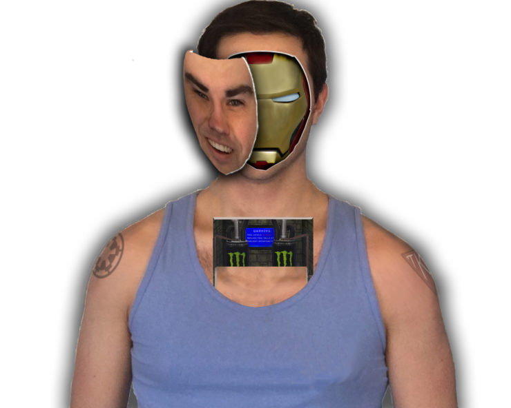 In order to portray that goal in my collage, I inserted the iconic Iron Man mask under my face to represent the desire that is always with me as well as speaks to my analytical mindset. In addition to this, I placed the Empire symbol from the Star Wars franchise and the symbol for Tau Kappa Epsilon fraternity on opposing shoulders in a mimicry of the patches and tattoos that soldiers wear in order to identify themselves to others. Finally, the cavity in the center of my chest is supposed to be a comparison between the power station of some building or large robot and what I use in order to stay awake and functioning every day.