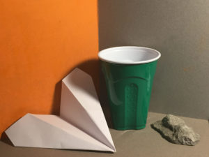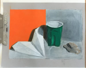While at WPI, I completed the drawing seen below in AR1100 essentials of art using colored sticks and paper (reference image below).  I’m fairly proud of this piece, as I had a firm belief that I could not draw anything.  The assignment was to assemble one final still life with at least one large difference in color (see the orange panel) and a cup or mug of some sort.  I decided to push myself and try to draw a rock in addition to the cup and paper airplane, as I had done very little work with natural objects throughout the rest of the course.