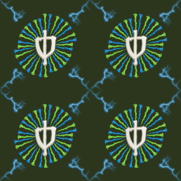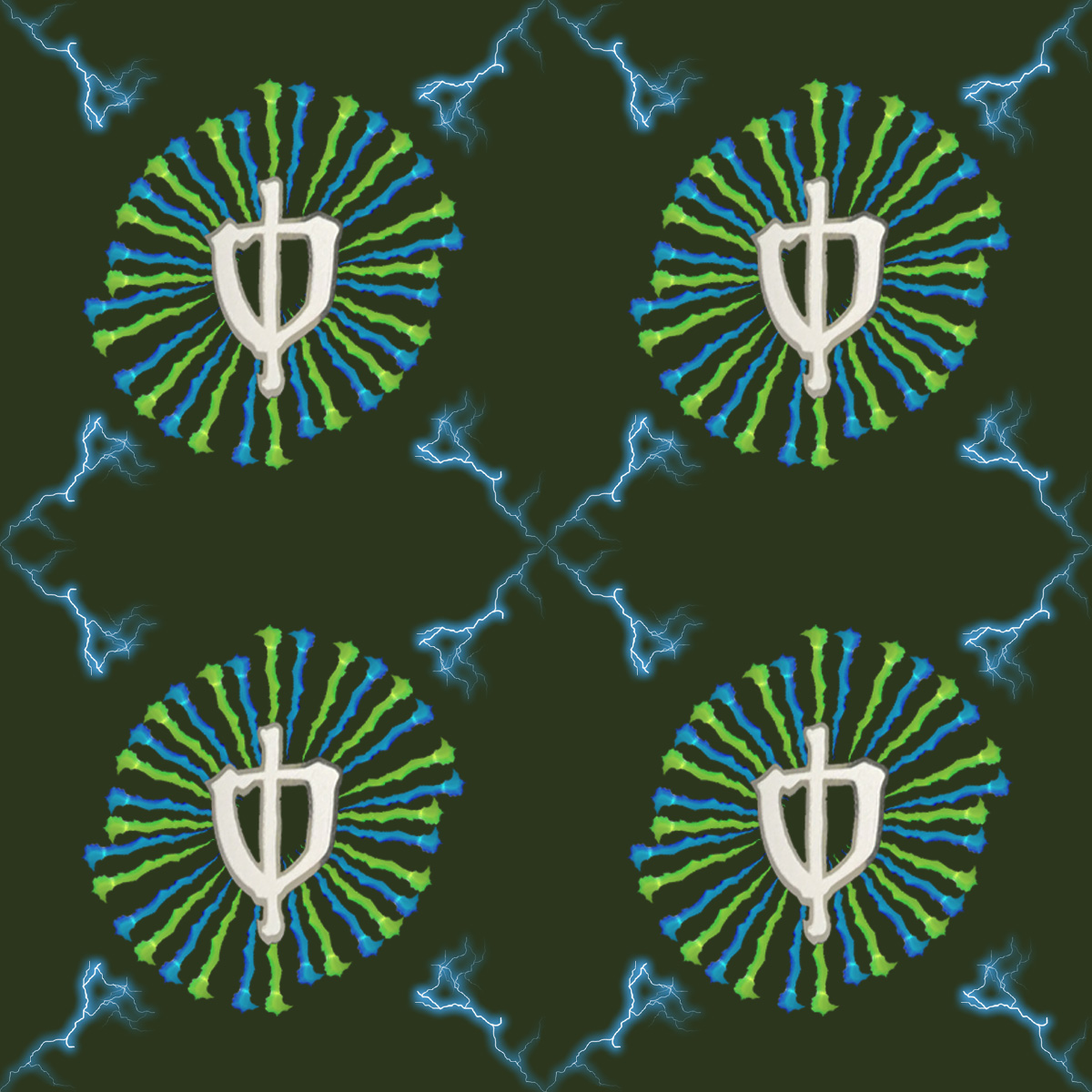 My second pattern falls under the synthetic category.  I took a picture of a can of Monster I had and used one part of the green “M” for the ring, while I cut the “o” from the word “Monster” for the center.  I did, however, download the lightning bolt in the corner of each tile, but it was edited somewhat to fit better with the rest of the image.