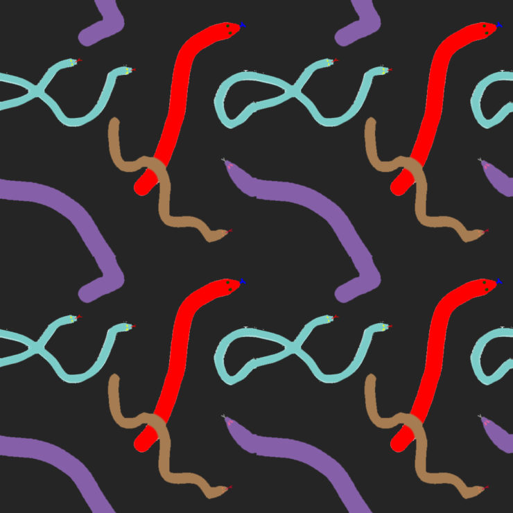 Some simple line sketch of snakes, different color schemes were used and parts at edges all connect seamlessly. I meant to have the snakes form some sort of symbol at first, but it didn’t turn out that great so here is what it’s like now.