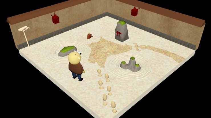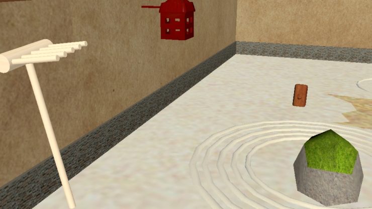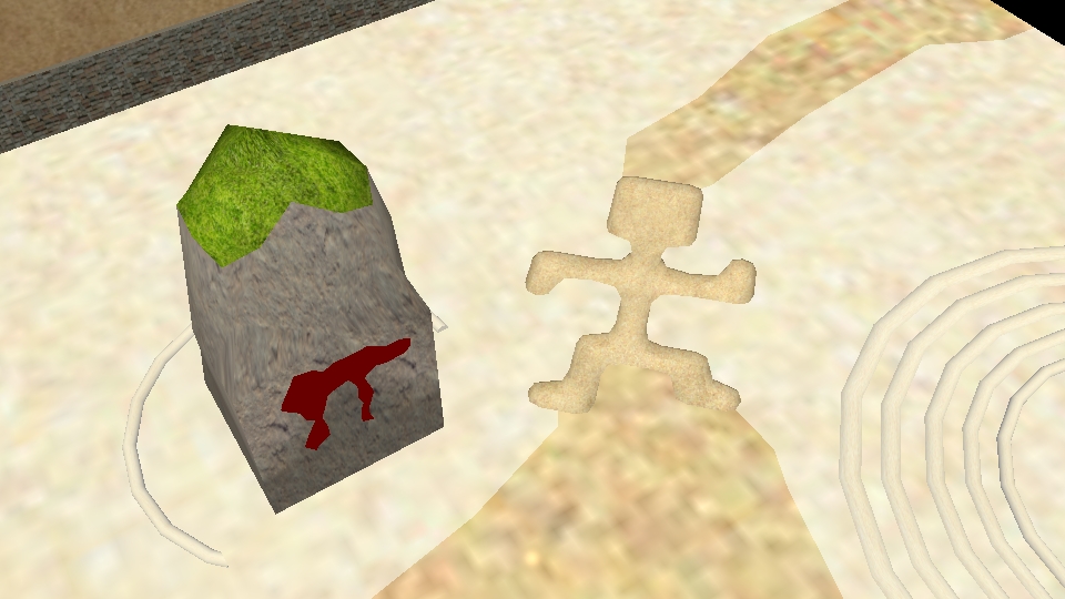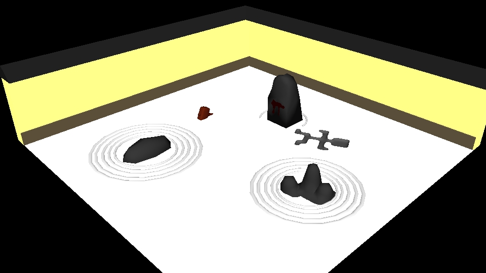 “I am a detective trying to discover what has happened here today at the zen garden. A murder of some kind has clearly transpired here, but how that murder was achieved is still a mystery. There is a leftover hammer that potentially belongs to the murderer, however it is most likely not the murder weapon. If a hammer of that size were used, there would be a lot more blood located everywhere than just the single rock. The gravel appears to be excessively disturbed, possibly meaning that the murderer and the victim fought beforehand. There is a faint outline of the victim’s fallen body, but there is no trace of the body. It appears to have been dragged away after the killing blow was made. Other smaller signs are a set of footprints approaching the area before the supposed scuffle happened. I currently need to figure out what the purpose of the hammer is suppose to be and, more importantly, who the killer is and what were his motivations.”