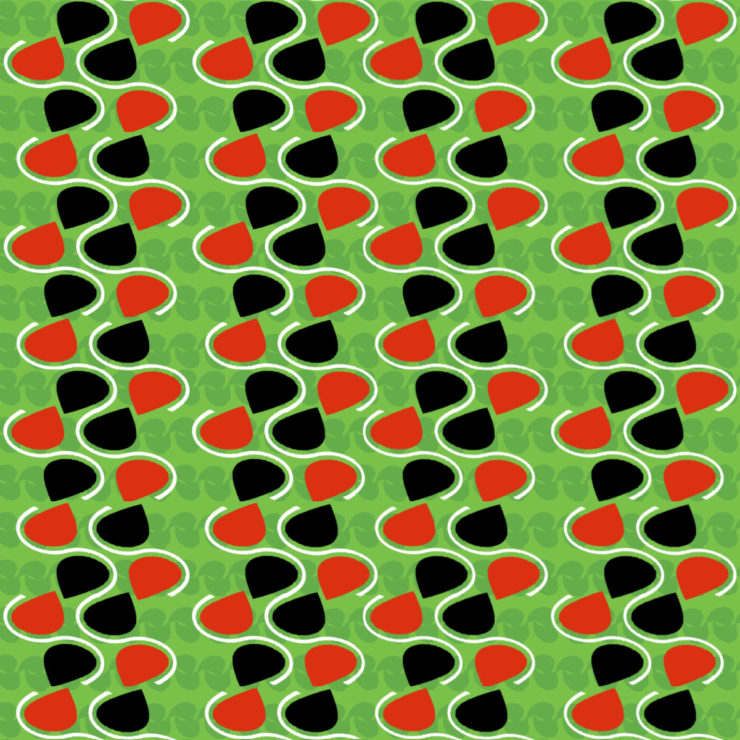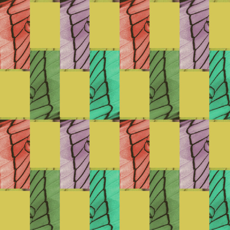The repeating images were taken from the wing design of a Chinese Moon Moth, an image of which happened to be in my inventory. By taking a part of the wing, blowing it up, and playing with the slanted designs of the pattern, I ended up making something headed for the “synthetic” range a bit. I was sort of inspired by late-80’s early-90’s backsplash designs.