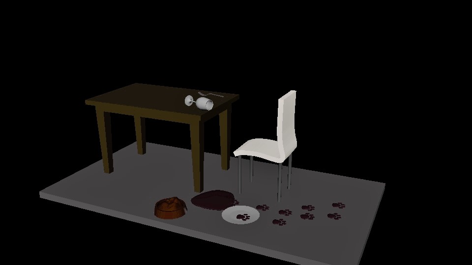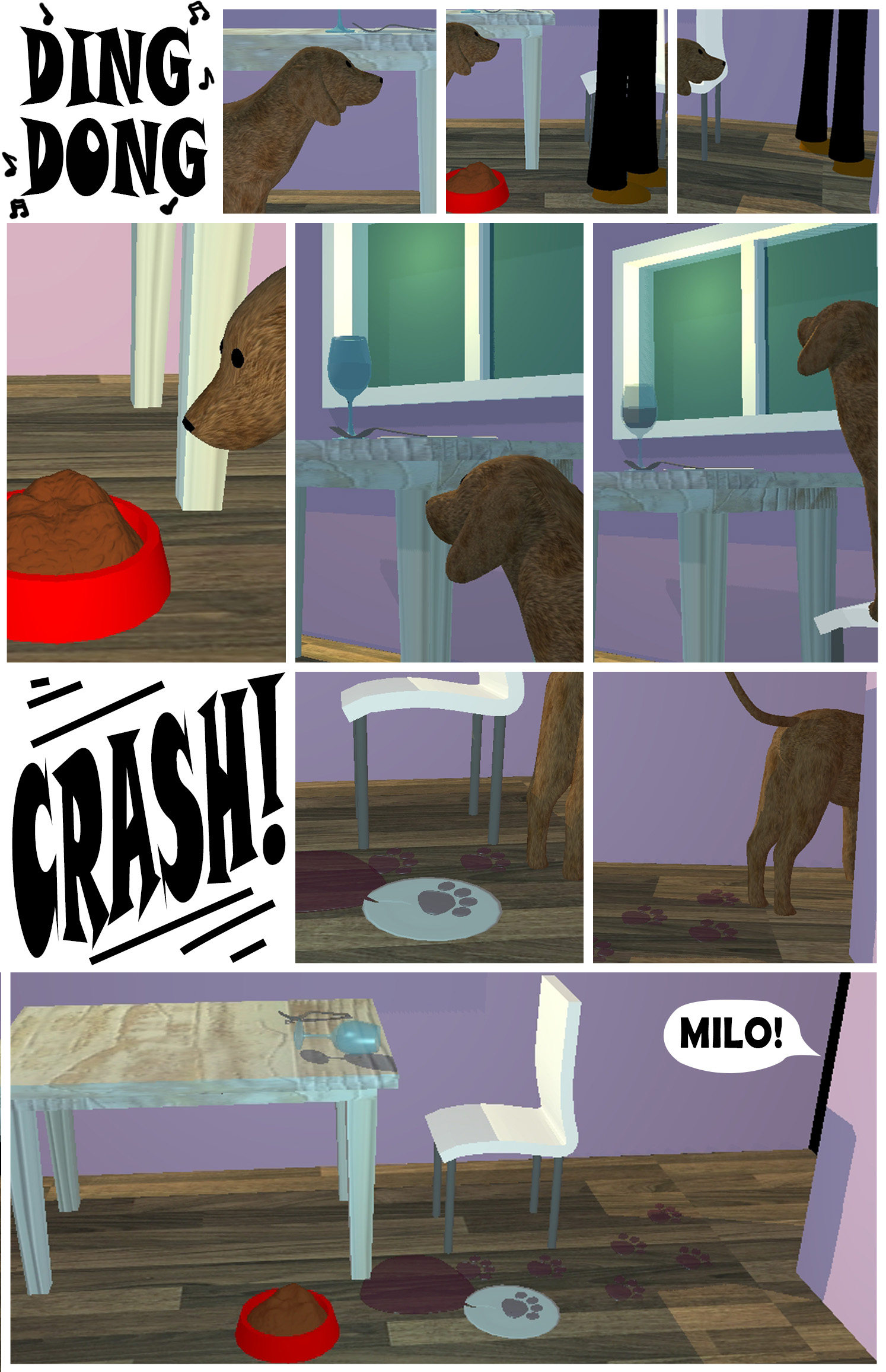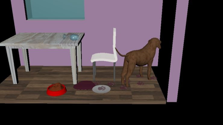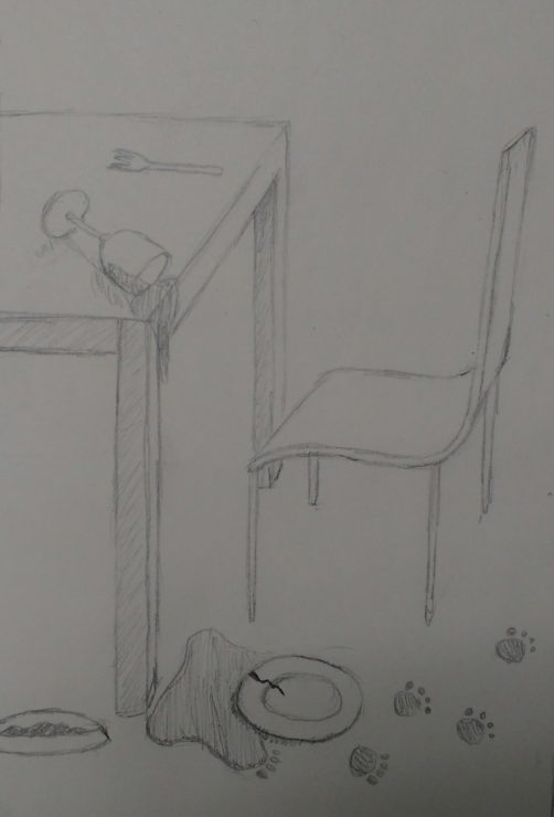 There was a ring at the doorbell. Ella unwillingly got up from eating her lunch to answer the door. It was just the postman dropping off a package. After signing for the package she returned to the table to find her lunch strewn all over the floor. Her glass had been knocked over and her plate was cracked on the floor. She remembered she had broken her rule, don’t leave your food unprotected. She noticed her dog Milo’s food was left untouched and there was a trail of footprints were leading to the kitchen. Milo was in big trouble.