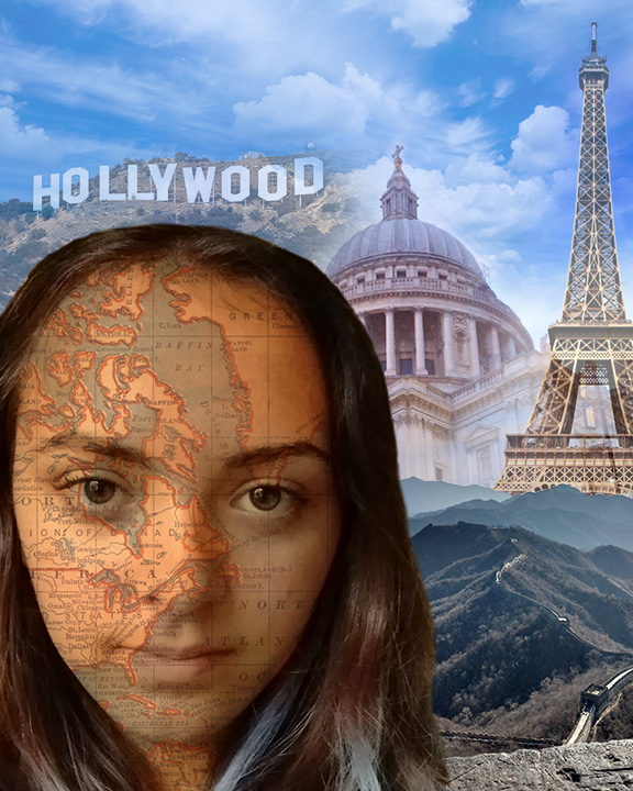 For my self-portrait, I decided to highlight my love of travel. In the foreground, I included an image of myself and I overlayed an image of a map onto my face. In the background, I collaged together several images of places I have either been or would like to go. I wanted it to look like I was taking a selfie in these locations. I included the Hollywood sign because I live in Los Angeles, St. Pauls in London, The Eiffel Tower in Paris, and the Great Wall in China. There were lots of other images I wanted to include but I didn’t want the image to get too crowded.