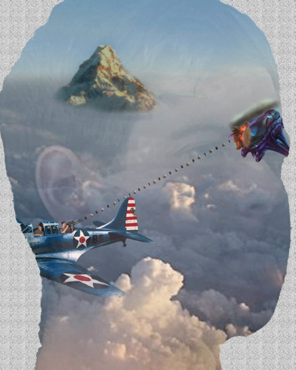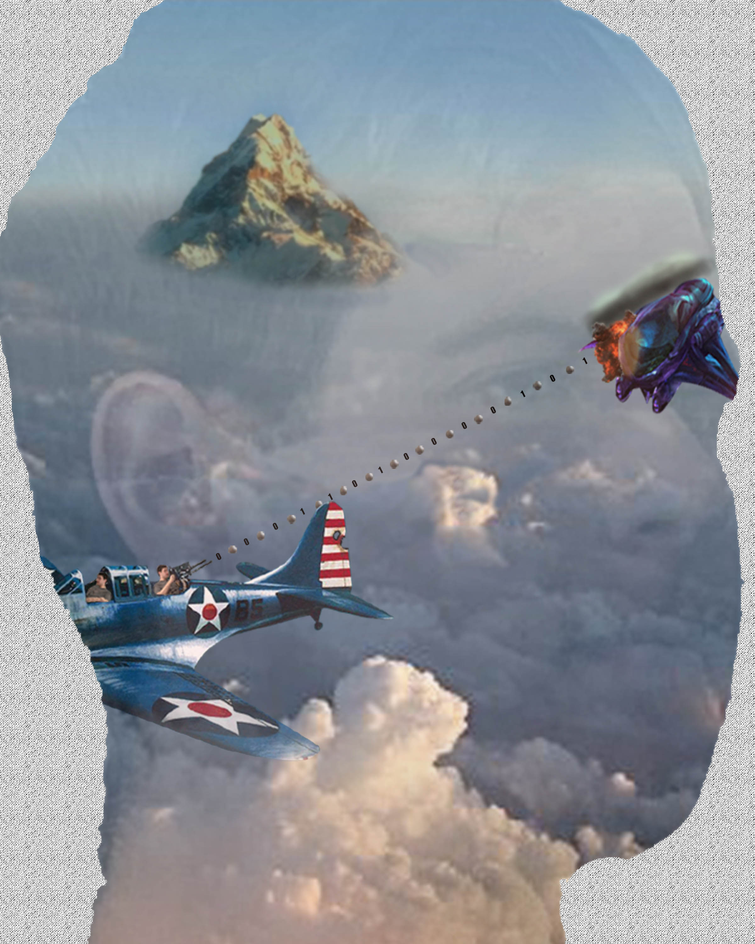 Gotta be honest, this is a mess, but I enjoy every piece of it. It is a cutout of my head with this random cloud picture masked onto it and a static-y background. The plane represents my interest in the military and history in general. I am both piloting and gunning the plane. The plane is shooting a stream of 1’s and 0’s, representing my major (CS) and love of coding, and shotputs, which I threw back in high school. The purple vehicle is a Banshee from the Halo series. It’s there both because I play a lot of video games but also because I think Halo is the best game series out there (Halo: Reach >>>>> the rest). The mountain in the background has a double meaning. Firstly, it’s the Lonely Mountain from The Hobbit, and although most people didn’t like the Hobbit movies I thought they were pretty good. Secondly, I like the outdoors and love to hike so what better way to represent that than a mountain. I chose to have a cloudy background: