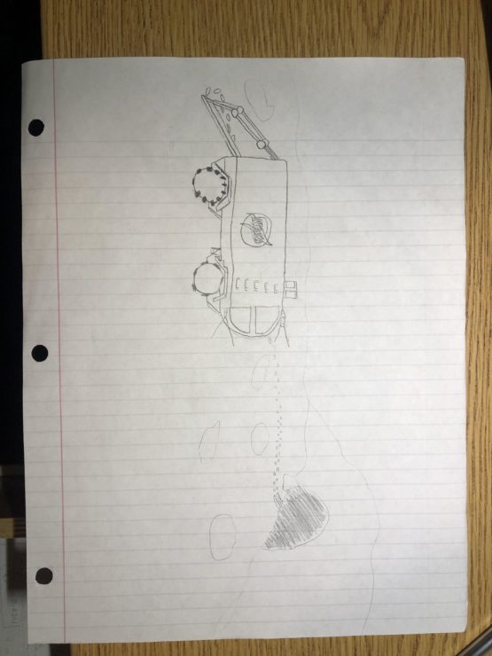 This is the whole mystery scene. The colors are slightly distorted from the rendering process but there are rocks, oxygen tanks, a broken helmet, the vehicle (of course), and the partially-obscured cave in the background. I had an issue with Maya where every time I imported an object the program would crash, so all objects had to be made in one scene.
