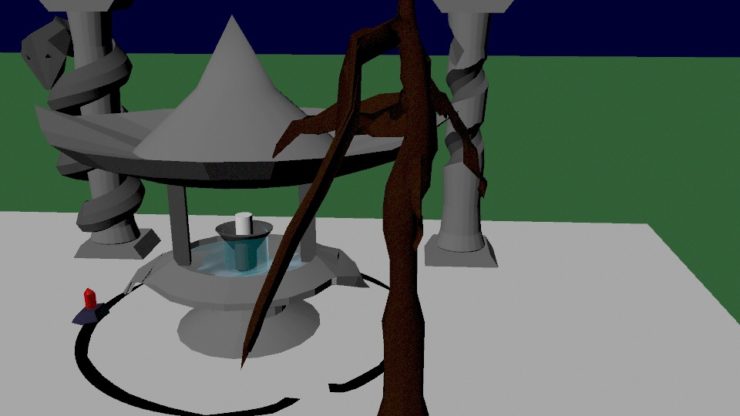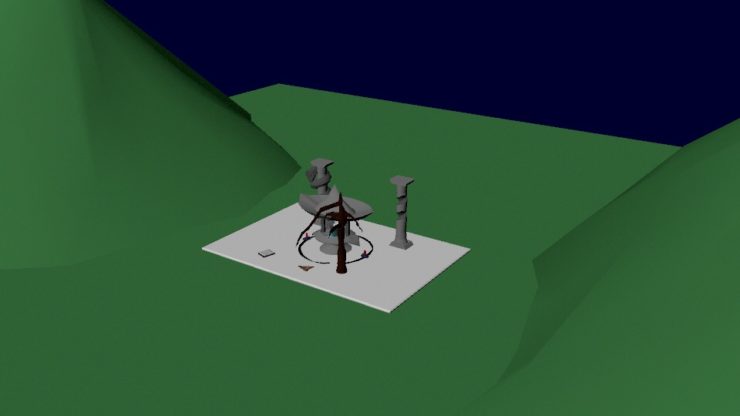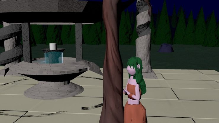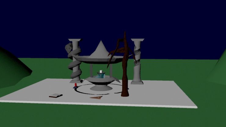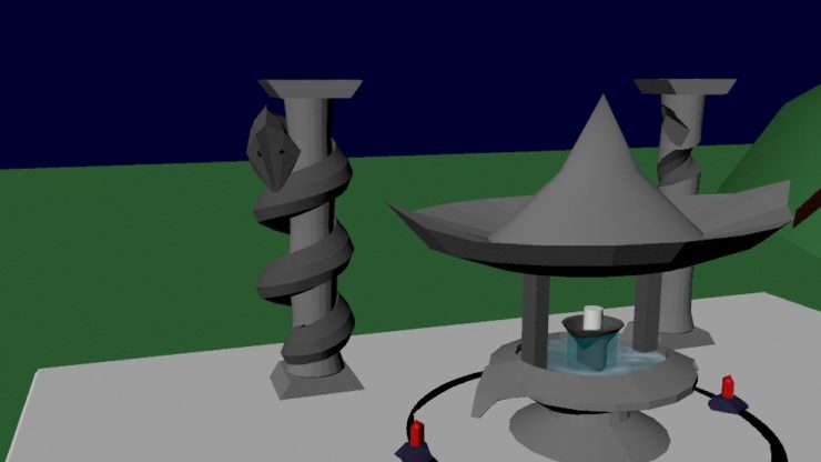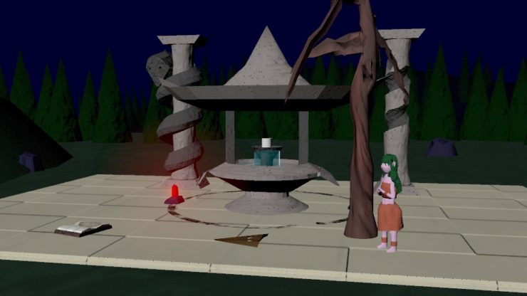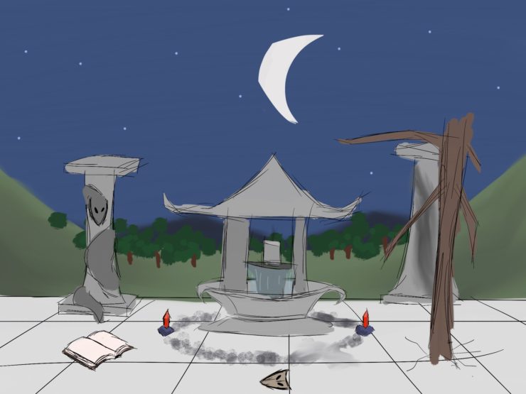 Tonight is the night of New Spirit’s Moon, and you, having been raised on stories of the guardian spirits, decided to camp out in the woods beyond the village. Perhaps you hoped to catch a glimpse of one of these spirits, or maybe you came here on a dare. The night was quite uneventful, until all of a sudden, you heard a large commotion coming from the north! You scramble to your feet and rush towards the source of the noise, but it stops as suddenly as it starts. Pressing forward, a break in the trees reveals a large clearing inbetween two hills. You gaze at the strange and chaotic scene in front of you. A magnificent fountain, with what appears to be a recently extinguished flame in the center, above the flowing water. Two pillars: one with a giant stone snake wrapped around it; the other left with markings suggesting something similar had once been there. A tree seemingly having sprouted right out of the stone tiles. Two red crystals on either end of a circle of ash. A spell book; likely belonging to one of the monks. And finally, an old wooden mask. Oddly enough, you find the mask to be the most concerning thing here. If the legends were true, then this was the mask of the guardian spirit. The mask is here, yet there is no spirit. The monks, if they were here, most certainly came to destroy this sacred place, but it is unfathomable that they’d leave such a powerful tome here. The circle of ash is broken; a ritual interupted. What in the world happened here?