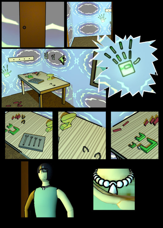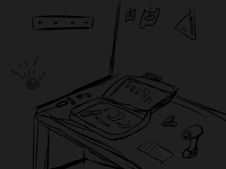 Your footsteps creak as you go into your workshop like every other day. The lights flicker before they turn on. The first thing you notice is an unusually shaped handprinted seemingly indented into the wall. It seems humanoid, but the fingers seem.. too long. You then realize all the metal seems to have disappeared from the workshop. For the most part, all that remains are the handles of the items that were useful tools. Even the metal hooks that held up your metal balancing ruler are gone, and all that remains of the ruler itself are the tubes that held the liquid and the bracing. The wrenches are gone too, all that remains are the indents were they originally rested. You hear a strange artificial humming – like a machine – coming from just outside the wall to your left. You shudder and wonder if you just missed the… creature that took your metal. Dousing the lights to avoid attracting unnecessary attention, you grasp the metal talisman at your neck, grateful that it is still in your possession.