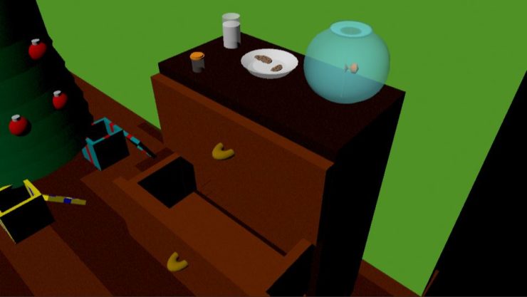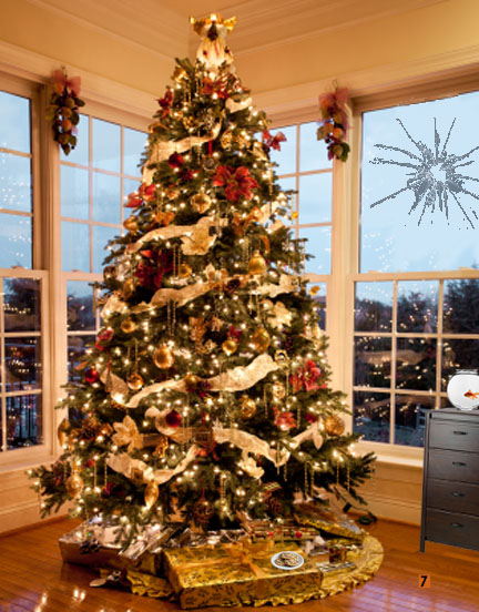 Objects: goldfish, gifts, glass, bullet, cookies, tree