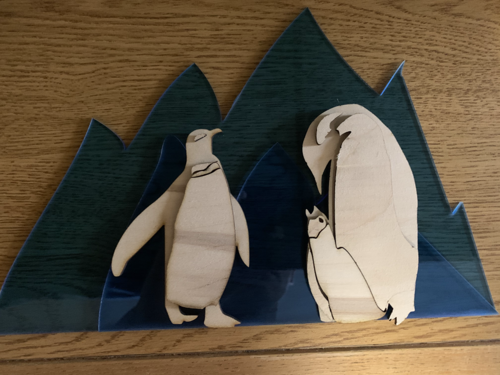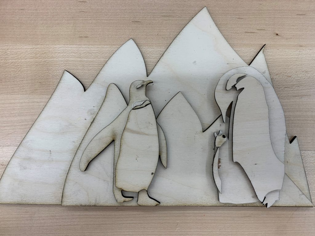 After cutting out the first draft in plywood I’ve decided upon a couple changes that I want to make. The most major one is that I want to fill some of the negative space on the baby penguin, by adding another piece between the stomach of the baby penguin and the adult penguin. I also am planning on adding supports to the back of the piece so it can stand on its own. One thing I noticed while I was cutting it is that the larger pieces took more passes than the smaller ones, so while I was cutting it the smaller pieces would fall in and then the successive passes would cut less precisely, so in order to fix that I’ll have to recolor the smaller pieces in the svg file so I can independently decide the number of passes and laser power for the big and small pieces. Since I decided that I wanted to have the piece be freestanding and the backdrop will be semi-transparent I’ll probably place the supports so that they are hidden by the penguins in the foreground. What do you think of the placement of the penguins relative to the rest of the piece? Should I adjust their positions or do you think they are good as is?