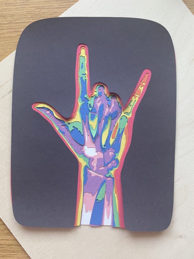 The only paper I had on hand to see the layers with was rainbow construction paper, but I honestly think it looks cooler with the crazy colors. The small cutouts actually got blown away by the fan system in the laser cutter, and so I would probably need to stick the paper onto a piece of cardboard next time to make sure all the pieces can be collected to add to the finished piece. My question to anyone looking at this is if I should play around with this colored construction paper as the material or to make it black and white?