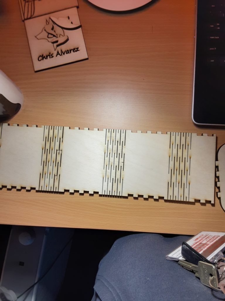 so far iv made three attempts to cut out the prototype and it took really long to find a happy medium. I will say that doing test is really helpful and informative. However, the kurf bends on my lantern don’t bend really well. this could be due to how thick the wood is or that the lines that were cut are not thick enough. So far its going well. I will say that what i really want to do with this project is a Japanese/tropical theme.