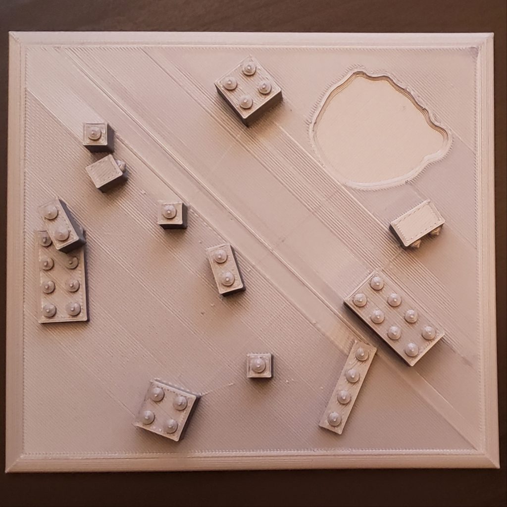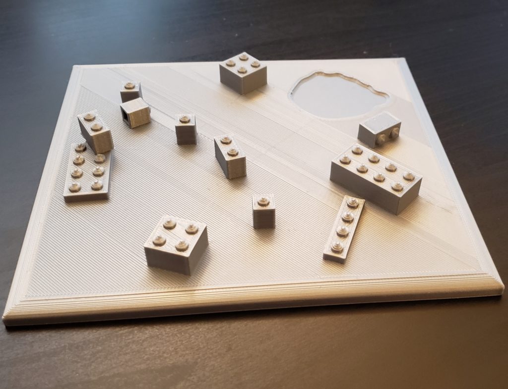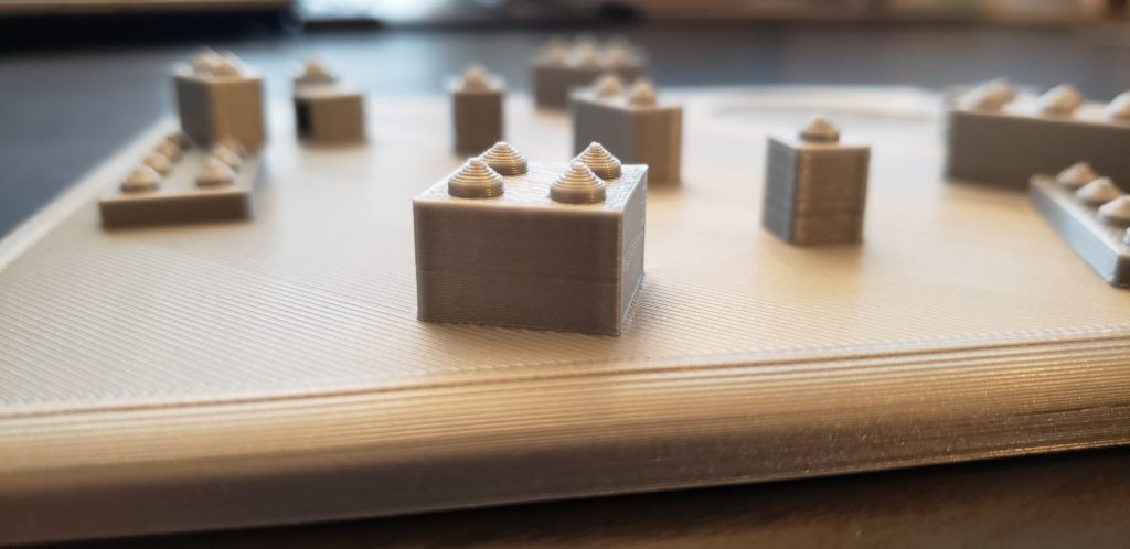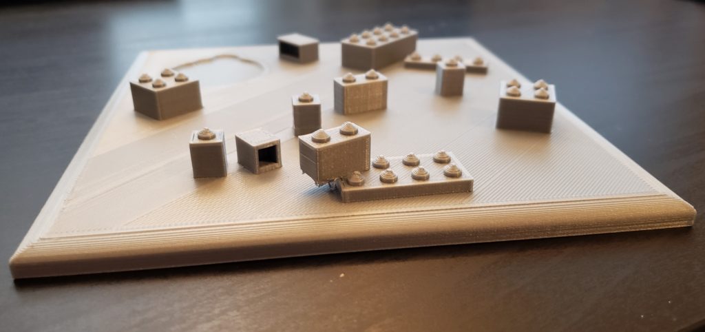 Printed base: There was a little bit of spaghetti under the overhanging LEGO, but overall turned out good. Real LEGOs do fit on but are a little loose, I think either because the radius of the nubs is a little too small, or I didn’t give them enough normal nub before the start of the spikes.