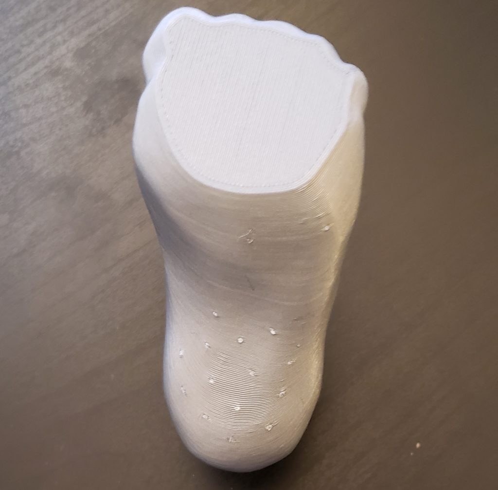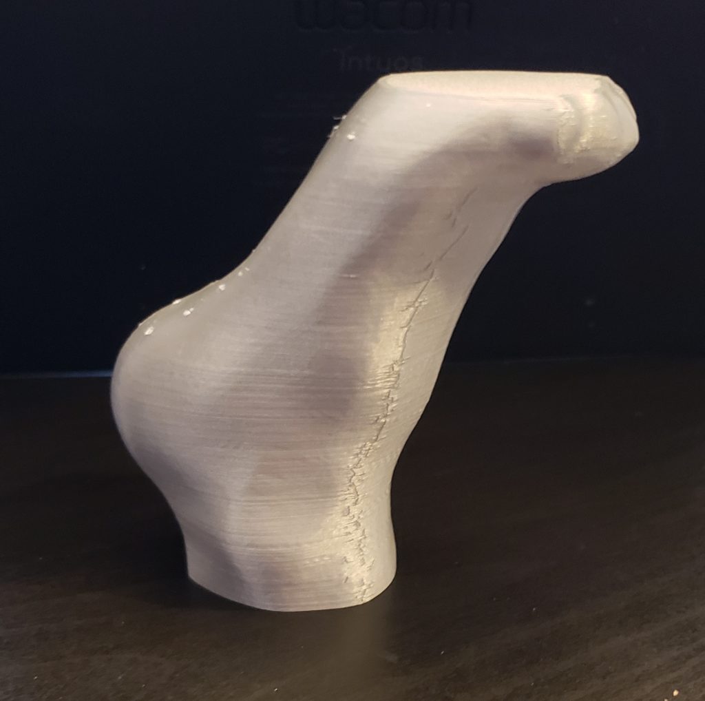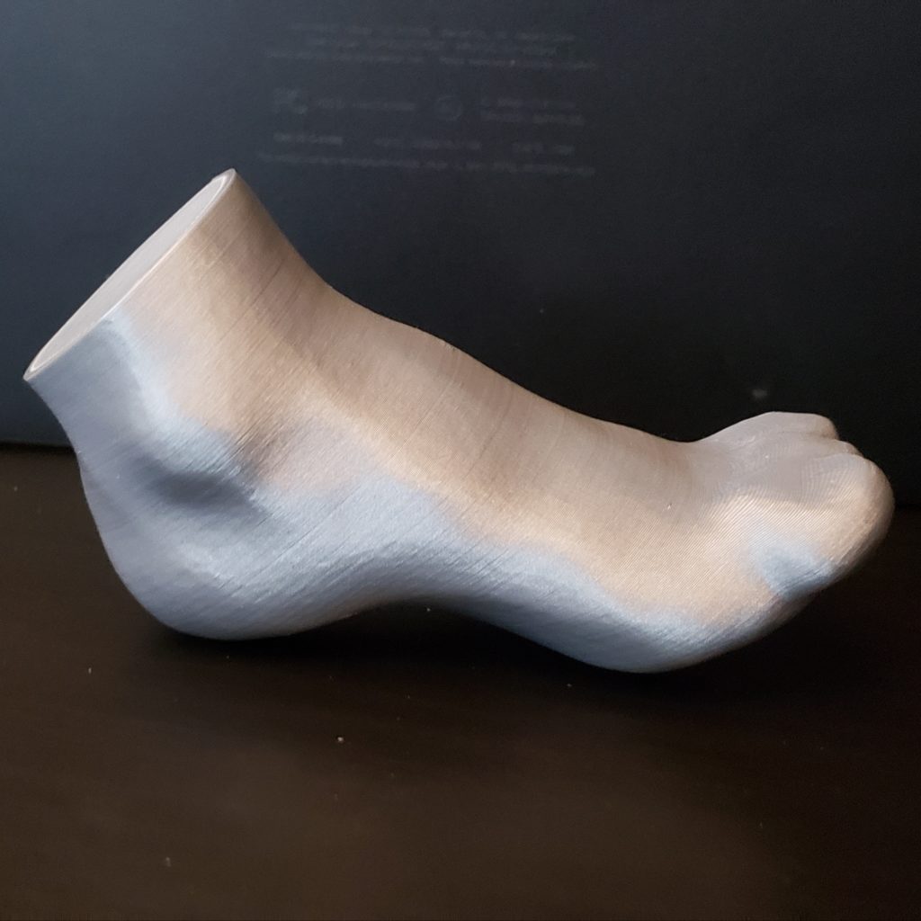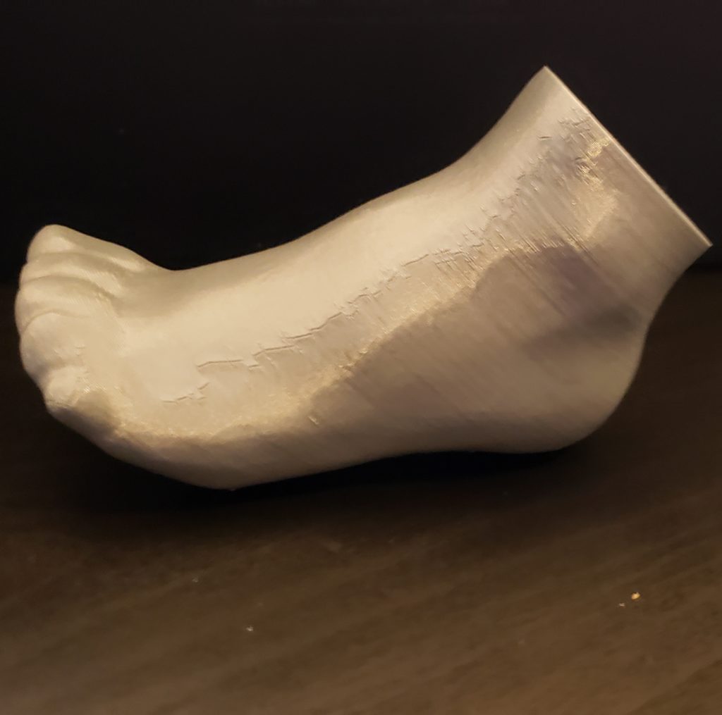 Printed foot: It looks like my friend’s printer has a little trouble with one axis, based on the crackly line going up one side of the foot. Otherwise it turned out pretty good and I’ll just need to sand down the spots from the support trees and the messed up line before I paint it.