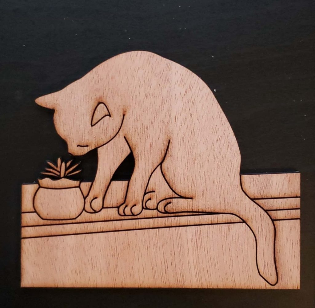 First Cuts First Cut – Erica Posted by Erica on April 1, 2021 My laser cut of Sir Cat came out great! The plant’s connection seems a little more delicate than I intended, so I’ll keep that in mind for future designs.