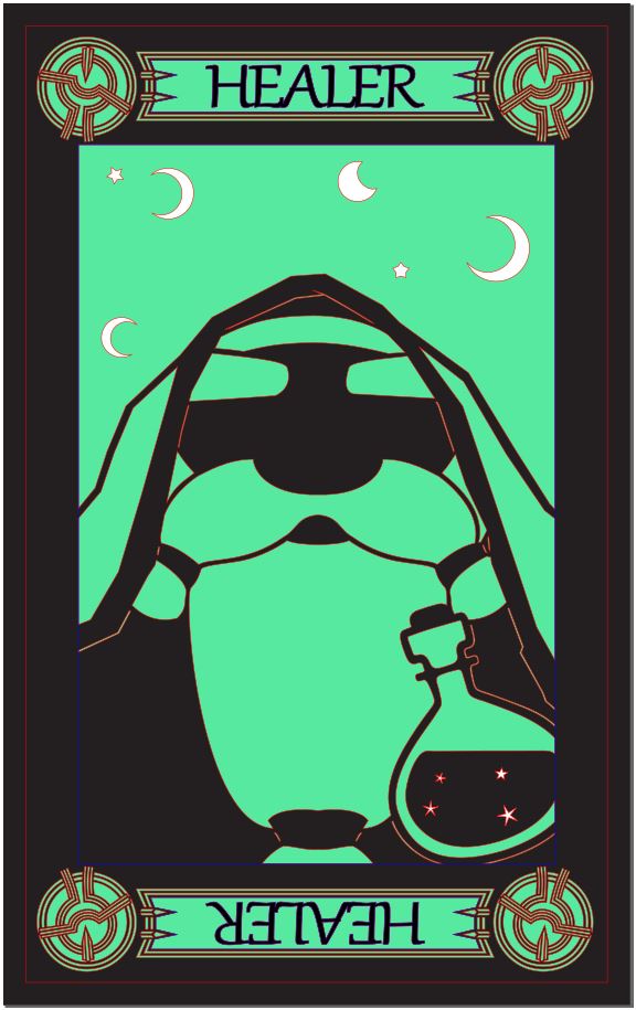 I’m still working on finalizing the vector drawings but below is what I have so far. I changes it to 3 sides instead of 4 so I have any hope of finishing it sometime soon. At this point the main thing I need to do is make the central drawing for the Healer card. I have a few other adjustments to make as well, like changing the font used in the Illusionist card because when I redownloaded inkscape the font I had chosen didn’t exist anymore. I’ll also need to alter the bottom piece to make space for adding lighting.