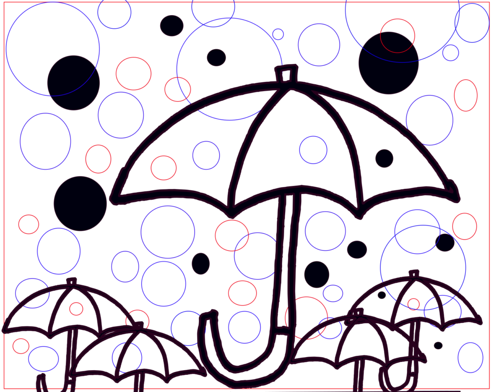 For design 2, I incorporated the drawing on paper into something in Inkscape. The drawing was one umbrella and then I copied and resized it for smaller versions. For design 3, the red rectangles falling were from the coding site and the circles and half circles were added.
