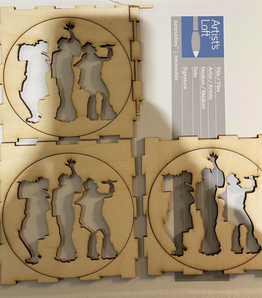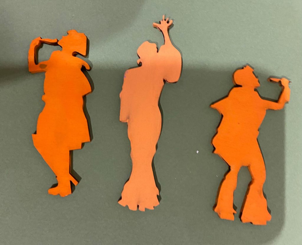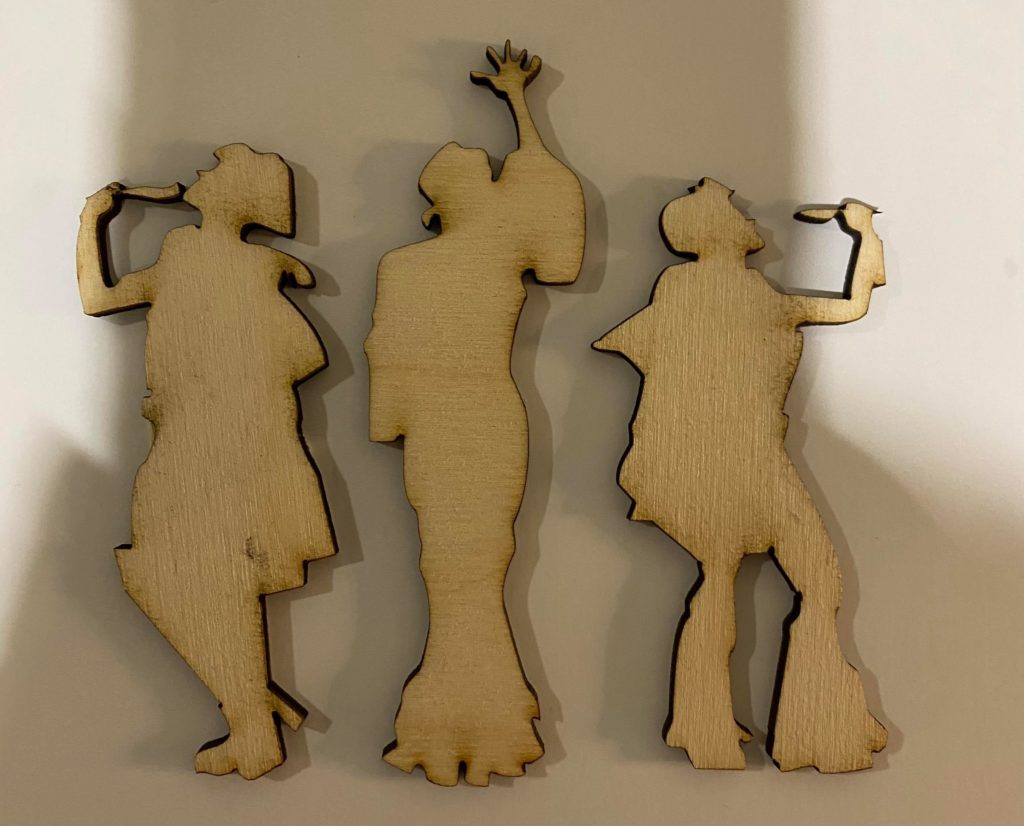 Update 2: I’ve painted the pieces now as well as the cut out figures. Some of the cut out lines and dots got covered by the paint but I’m hoping light will still pass through. After everything’s assembled I will temporarily put the piece together.