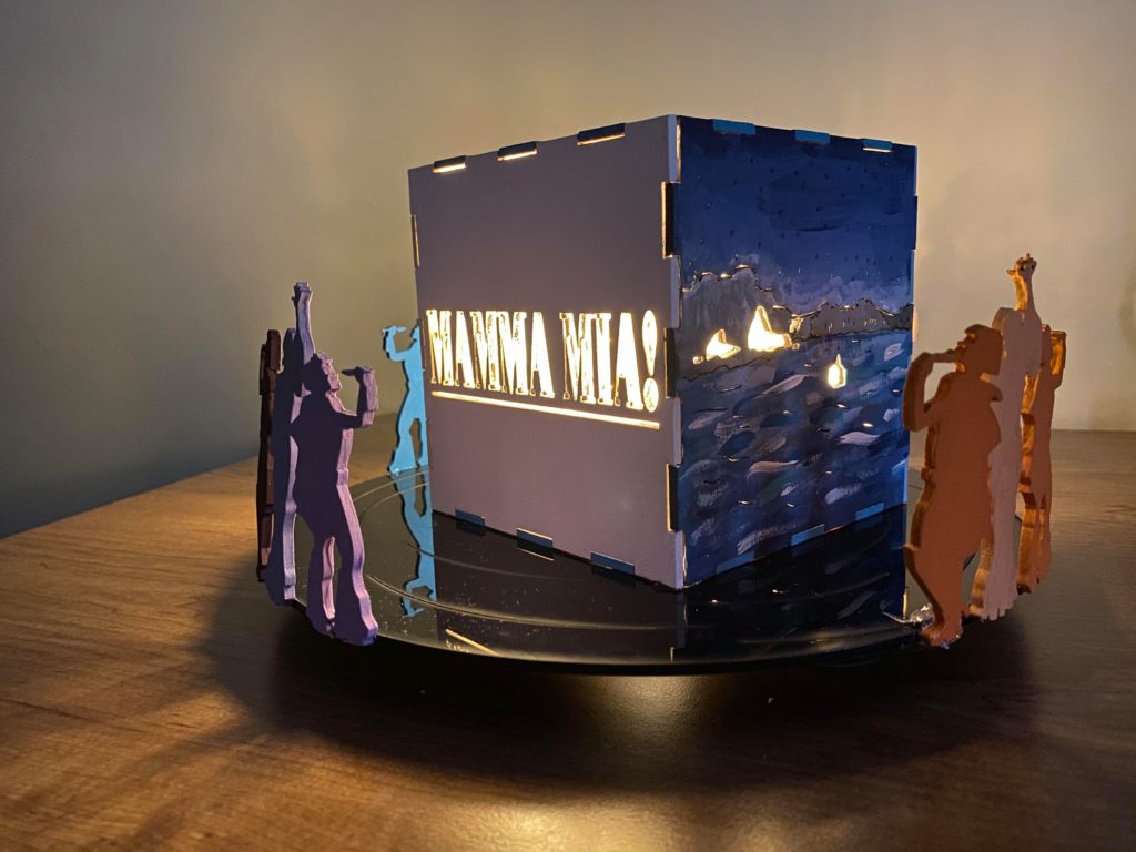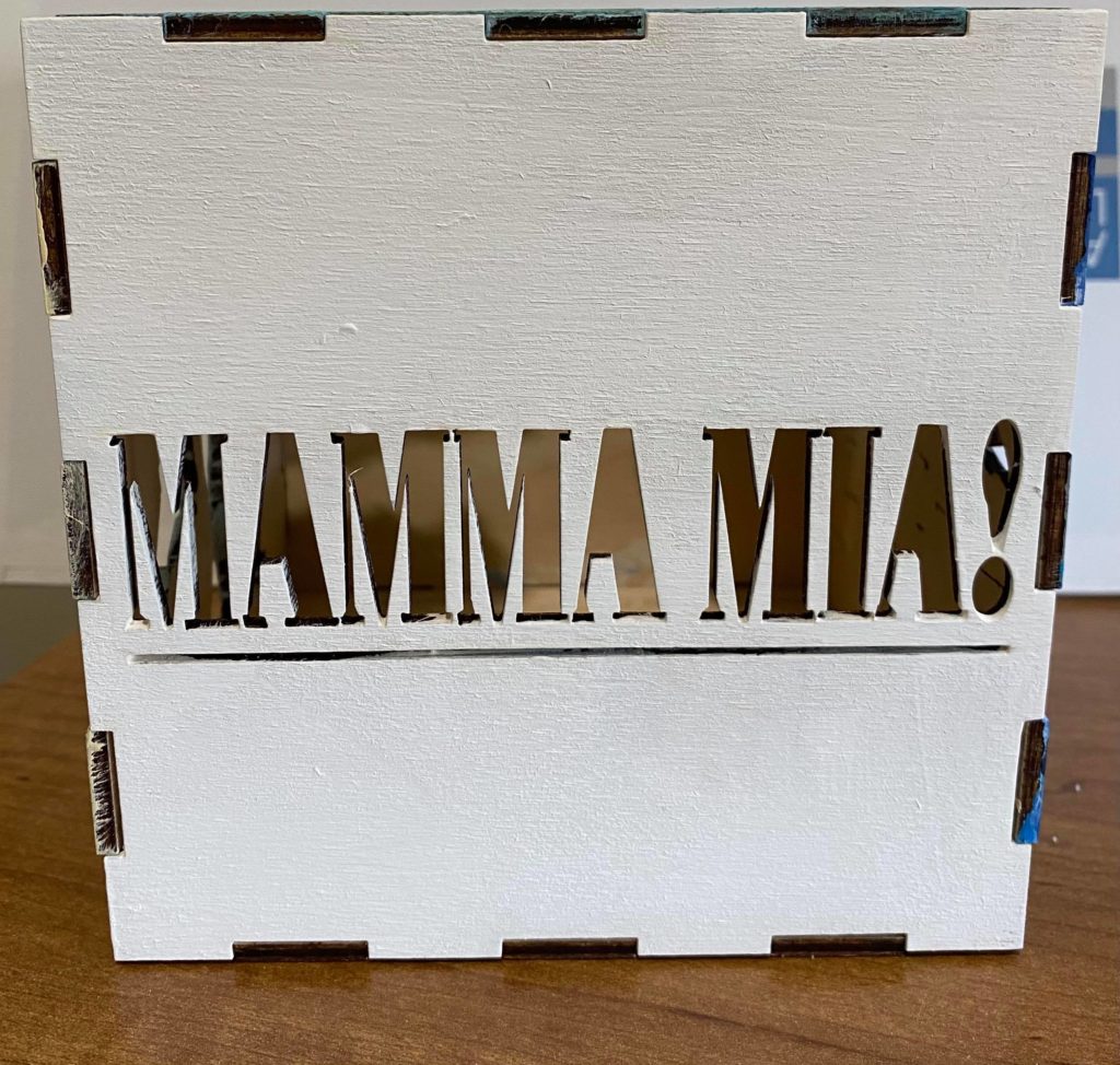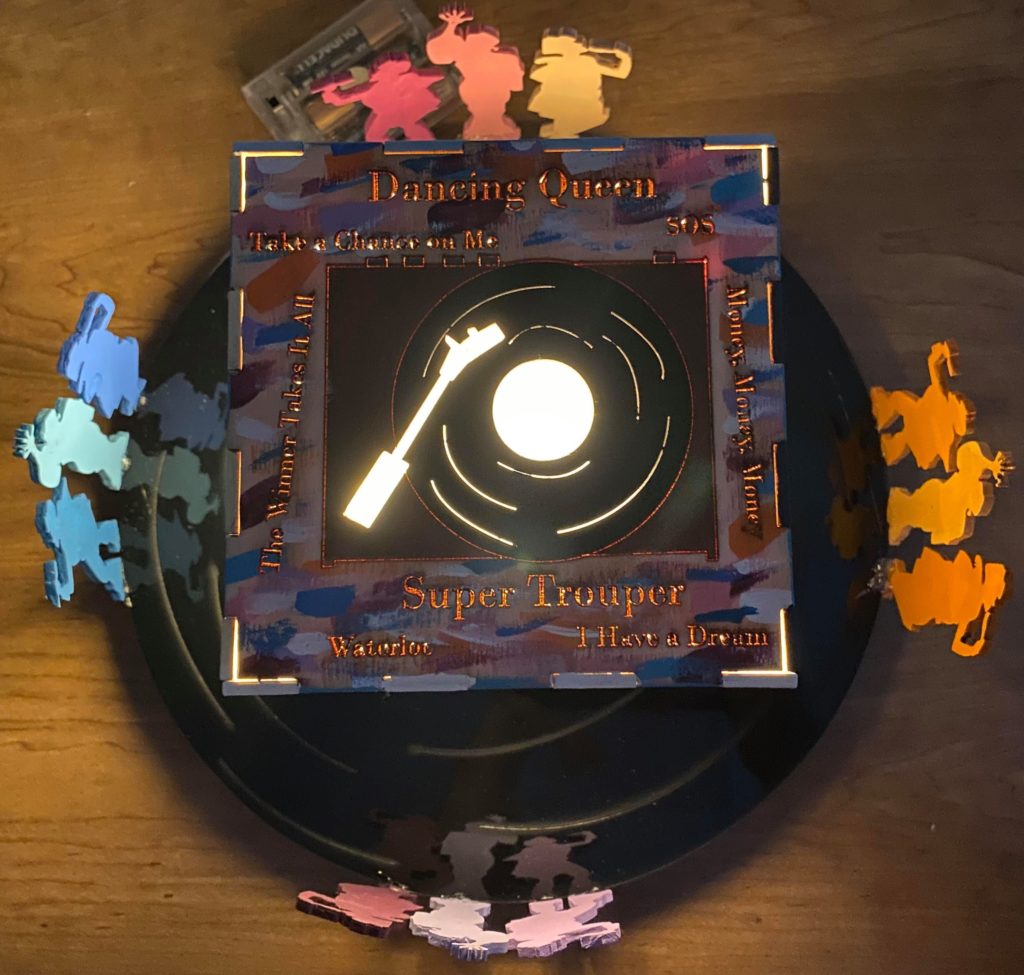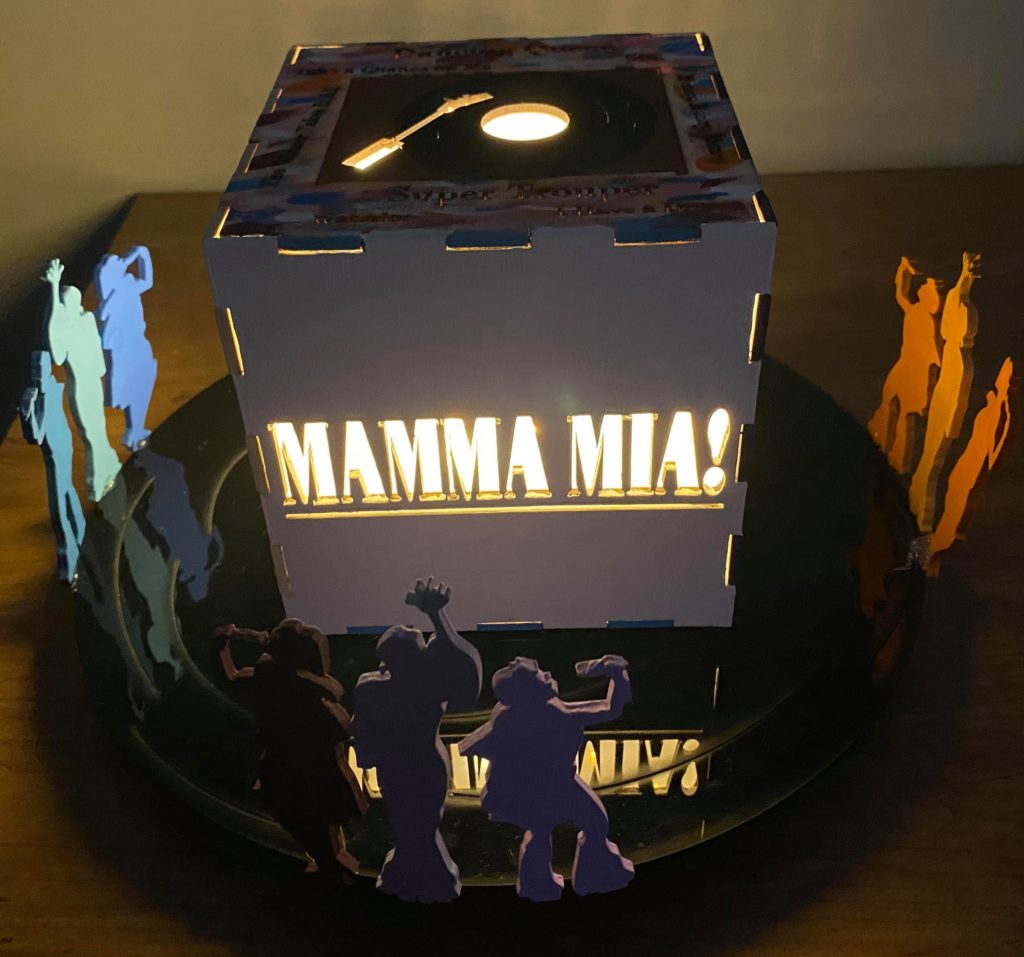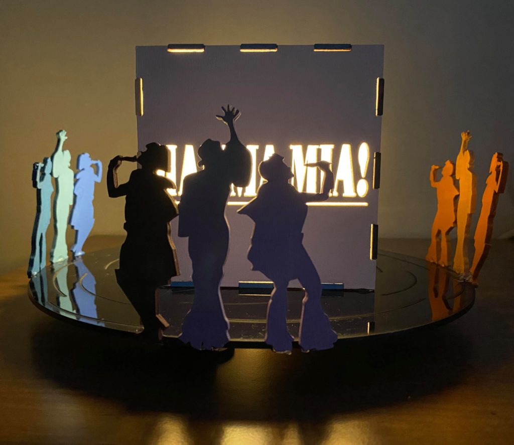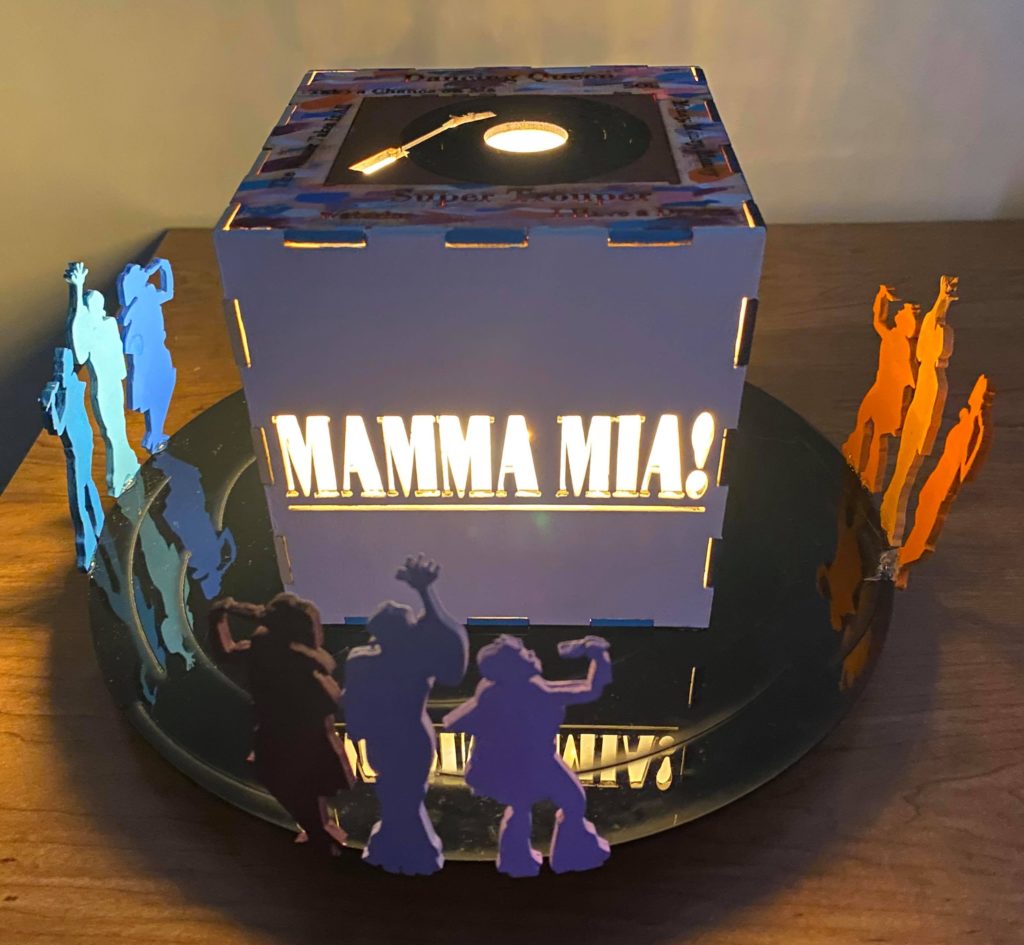 Update 1: I realized I liked how the record side of the cube with the song titles came out rather than the cut out of Donna running for the top. I was hoping I would be able to switch the two pieces without needing to cut them again but I do need to cut them again because it doesn’t fit exactly. I won’t be able to cut them until early next week so I still plan on finishing the pieces I have in case I change my mind about the order. As a result I’m going to wait before putting the lights into the piece. I also decided on incorporating a platform. It wouldn’t display all 6 sides but would allow the cut out from the 6th side (Donna running) to be visible. Either with wood or acrylic or a combination, the lantern is going to rest on a record (the record’s label is either its own layer or even with main record piece), and the cut out pieces I have of Donna and The Dynamos and one of the Donna running cut outs would be attached to the edge. I think I’ll apply paint to all the pieces I have but will see how it looks likes with different quantities attached. Similarly this can’t be done until early next week.