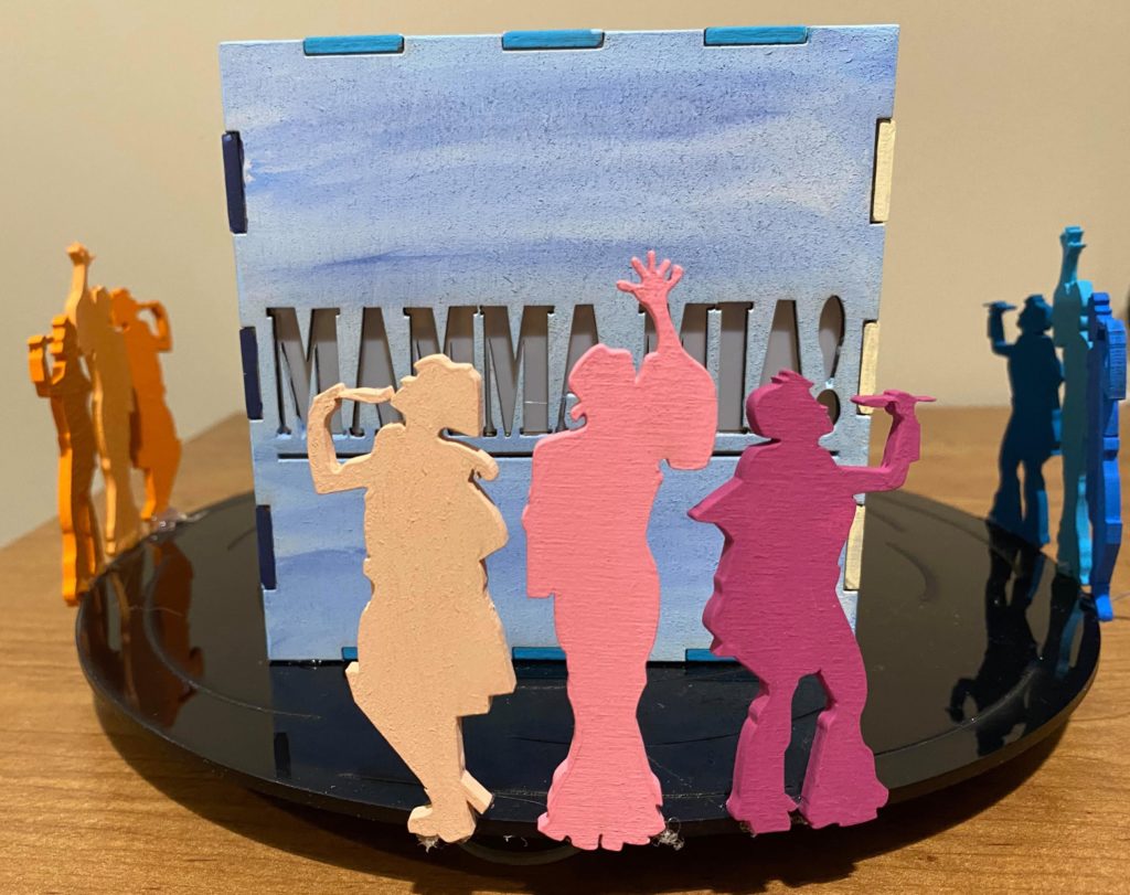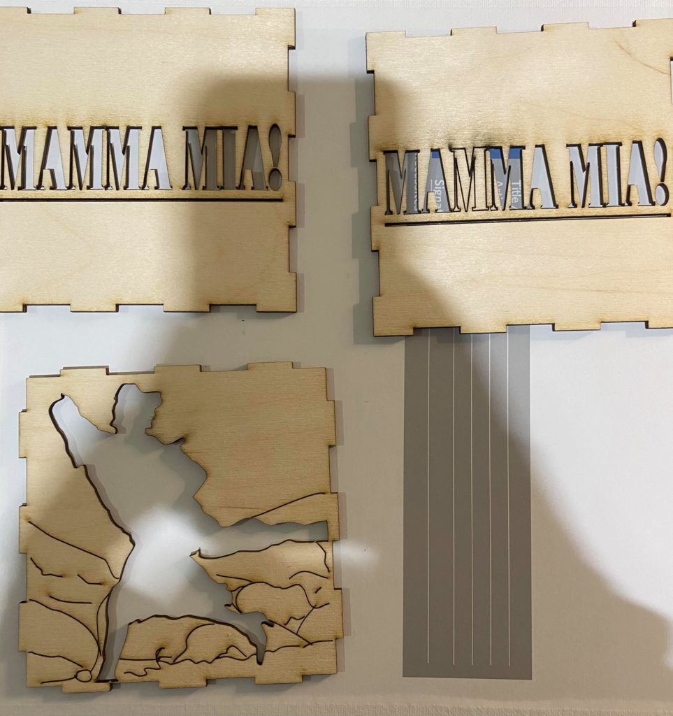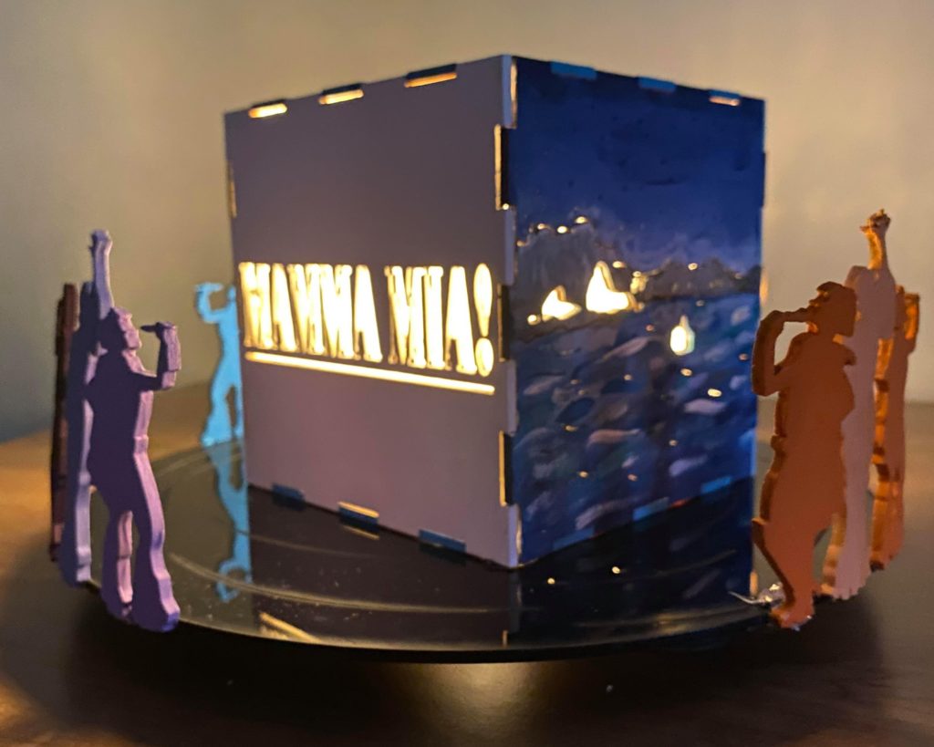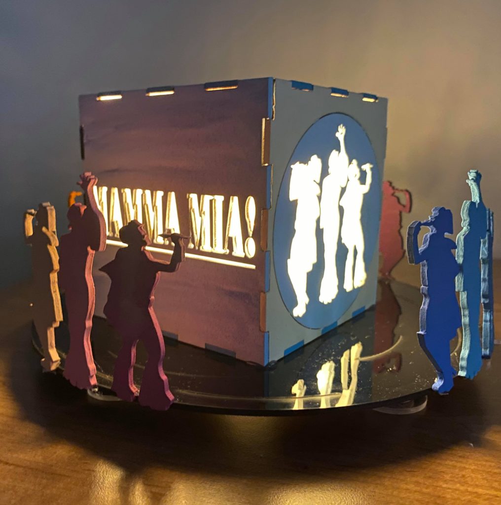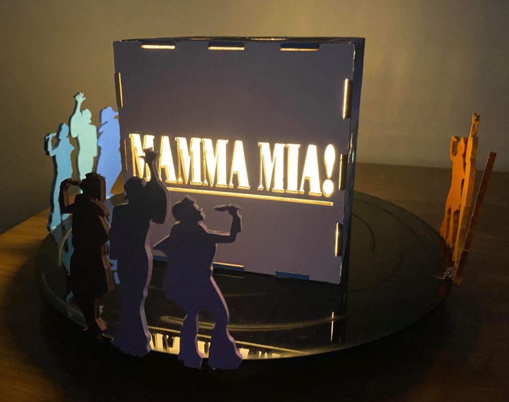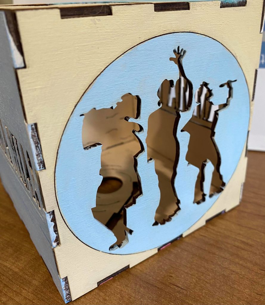 Update 1: I realized I liked how the record side of the cube with the song titles came out rather than the cut out of Donna running for the top. I was hoping I would be able to switch the two pieces without needing to cut them again but I do need to cut them again because it doesn’t fit exactly. I won’t be able to cut them until early next week so I still plan on finishing the pieces I have in case I change my mind about the order. As a result I’m going to wait before putting the lights into the piece. I also decided on incorporating a platform. It wouldn’t display all 6 sides but would allow the cut out from the 6th side (Donna running) to be visible. Either with wood or acrylic or a combination, the lantern is going to rest on a record (the record’s label is either its own layer or even with main record piece), and the cut out pieces I have of Donna and The Dynamos and one of the Donna running cut outs would be attached to the edge. I think I’ll apply paint to all the pieces I have but will see how it looks likes with different quantities attached. Similarly this can’t be done until early next week.