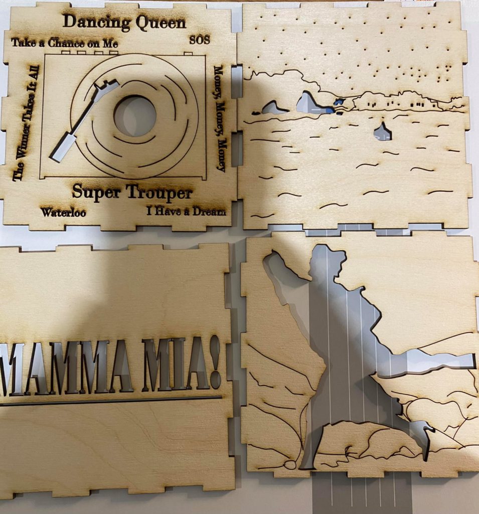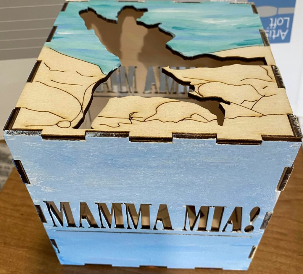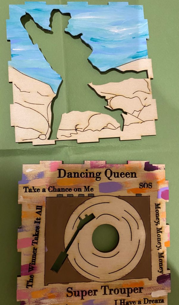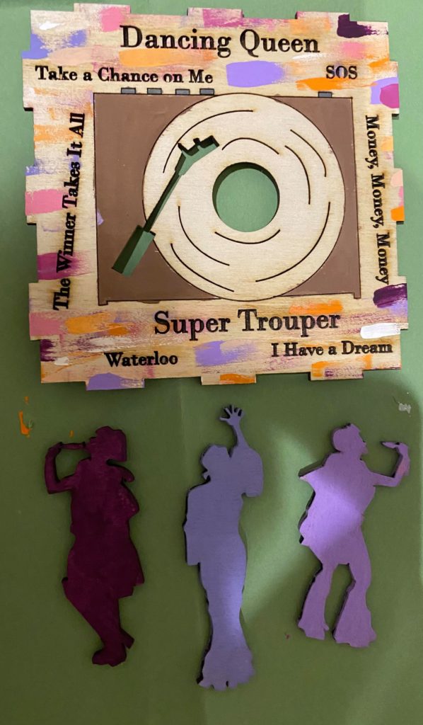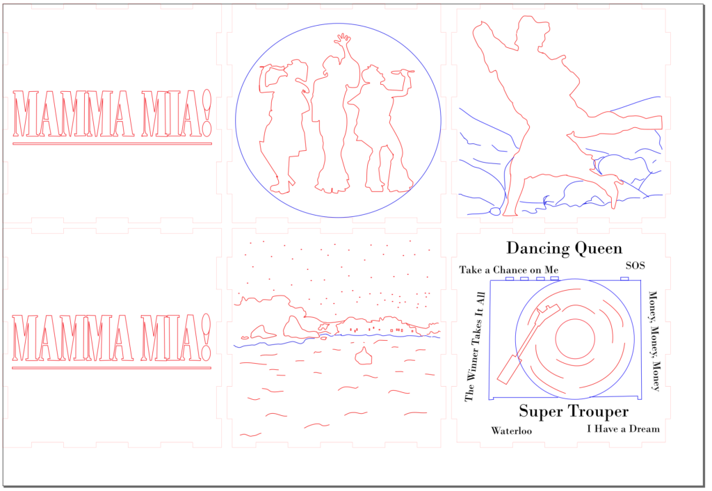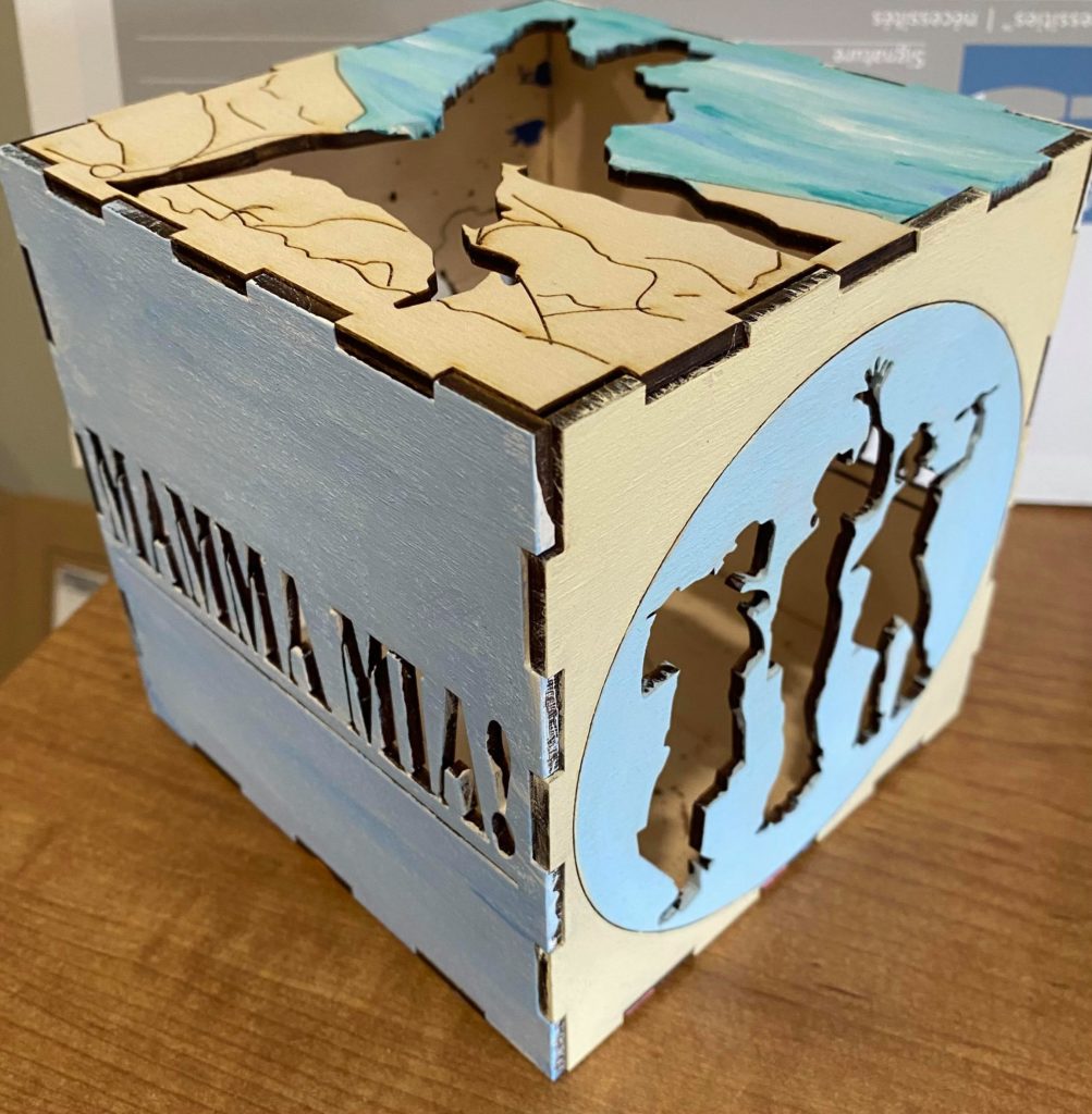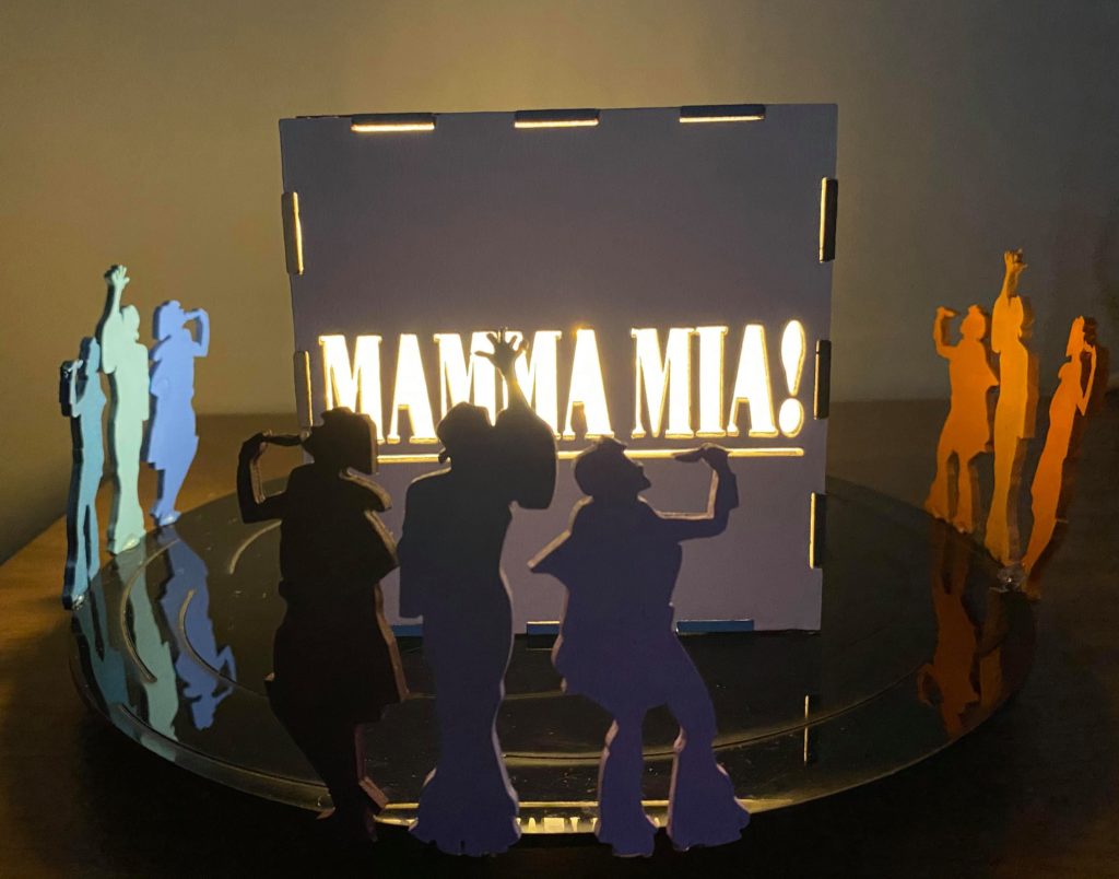 Update 1: I realized I liked how the record side of the cube with the song titles came out rather than the cut out of Donna running for the top. I was hoping I would be able to switch the two pieces without needing to cut them again but I do need to cut them again because it doesn’t fit exactly. I won’t be able to cut them until early next week so I still plan on finishing the pieces I have in case I change my mind about the order. As a result I’m going to wait before putting the lights into the piece. I also decided on incorporating a platform. It wouldn’t display all 6 sides but would allow the cut out from the 6th side (Donna running) to be visible. Either with wood or acrylic or a combination, the lantern is going to rest on a record (the record’s label is either its own layer or even with main record piece), and the cut out pieces I have of Donna and The Dynamos and one of the Donna running cut outs would be attached to the edge. I think I’ll apply paint to all the pieces I have but will see how it looks likes with different quantities attached. Similarly this can’t be done until early next week.