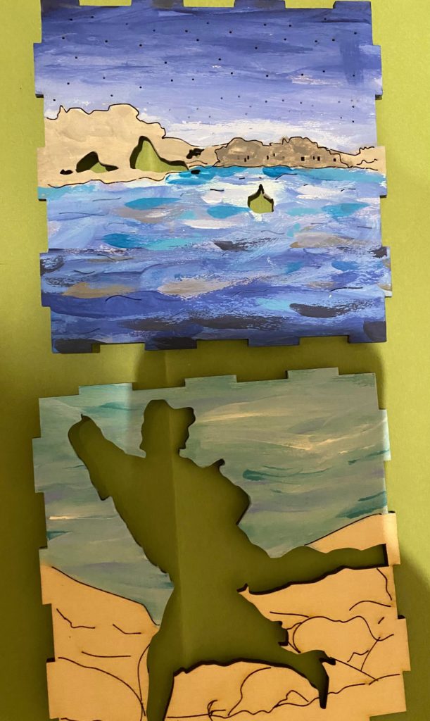 Hi! I noticed the colours you incorporated into your piece – I feel that they are good choices for representing the movie (and they all look nice together with the different shades of blues). I agree that it would be nice to paint the edges; are you planning on painting them the same colours as the piece they’re attached to or a different colour?