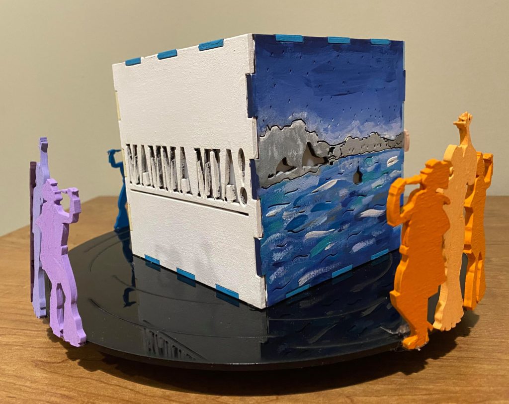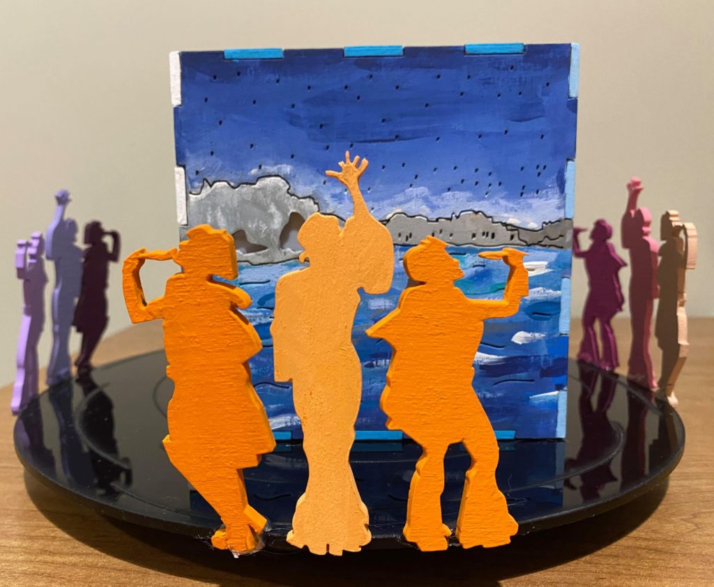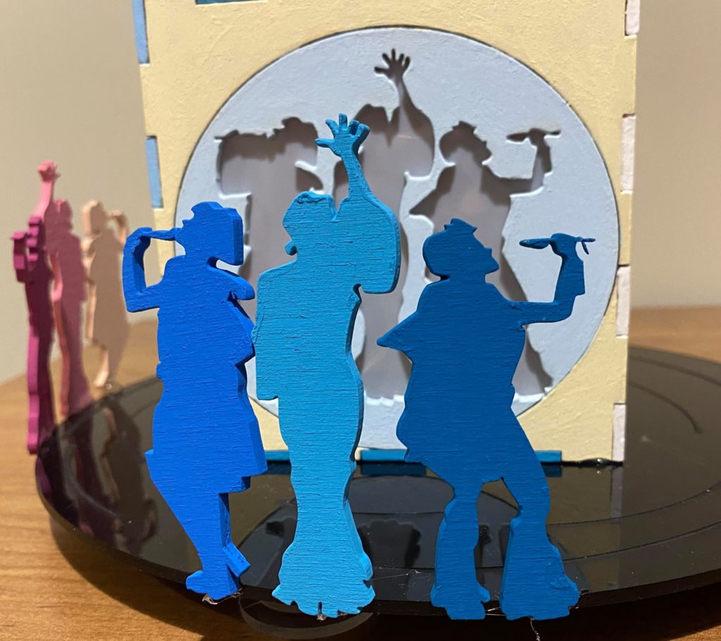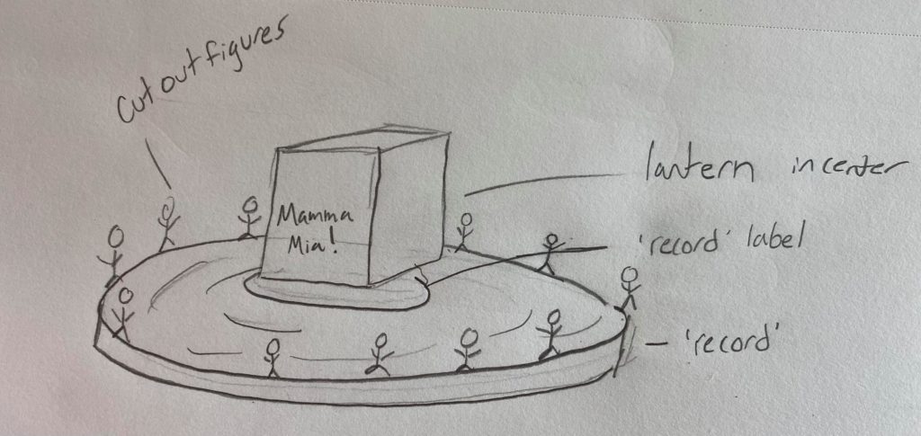 Update 6: The piece is finished. I recut and painted new pieces for the lantern because the original lantern pieces still weren’t fitting together. I waited till after I put the box together to paint the edges of the pieces to avoid the problem from the original box. I put the platform together and grouped the figures to be in front of one of each of the sides of the lantern. I also added several pieces onto the bottom of the record so that it’s lifted up and the wire for the lights won’t cause it to be uneven. It’s not tall enough to hide the battery pack under the record but can partially cover it.