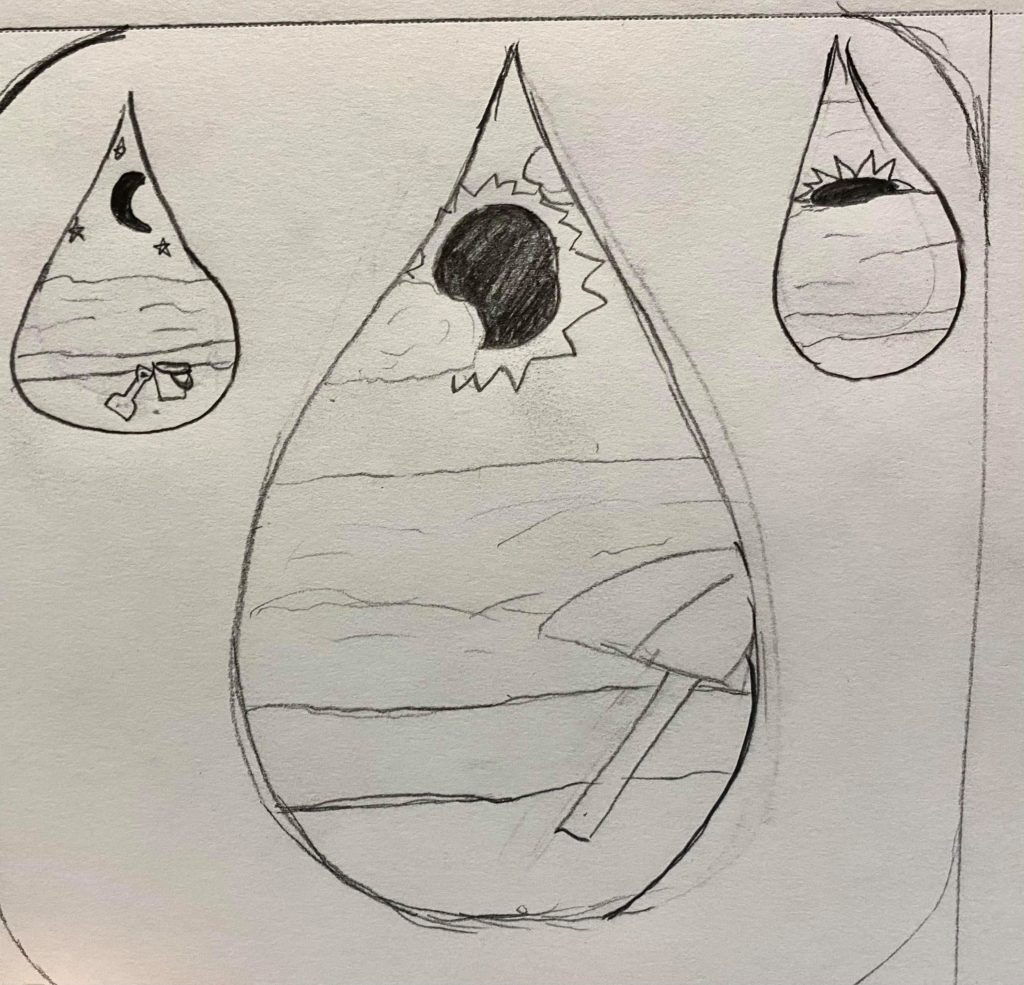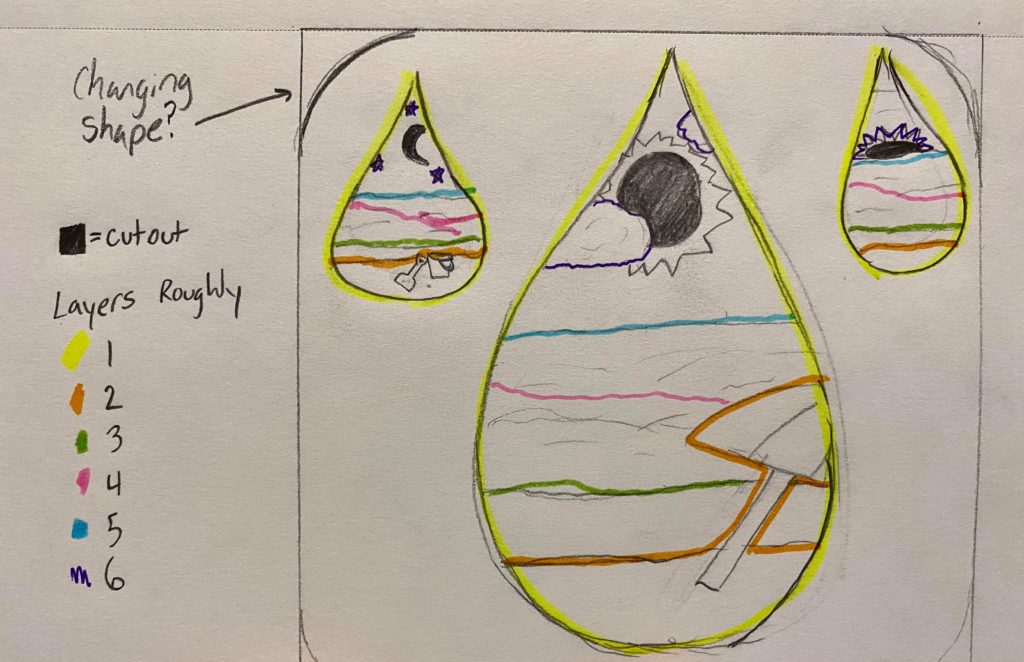 From these inspirations I made the top layer of the piece be a shape relating roughly to the piece. The shape is water drops and the scene that was created was a beach scene. For the very back layer and throughout, smaller details would be added by hand by paint/marker/pen depending on the material I used. Similar to Hazel Glass, I’m considering using paper/cardstock which would be easier to have each layer be a different color then if I were to try to paint all the wood or even trying to layer acrylic properly. Another inspiration for the overall shape of the material (a square with rounded edges) comes from looking at my fellow classmates submissions when we were meant to add comments and statements of meaning to them. I found I really liked when the cut square was changed to have the rounded edges so I’m thinking of incorporating that.