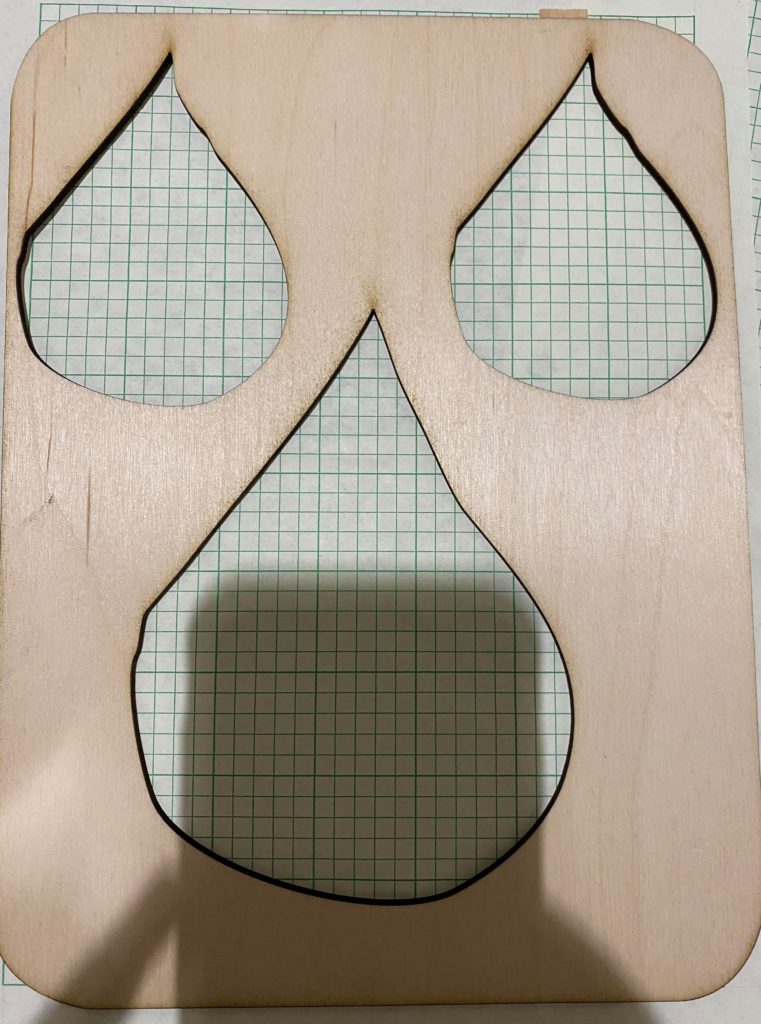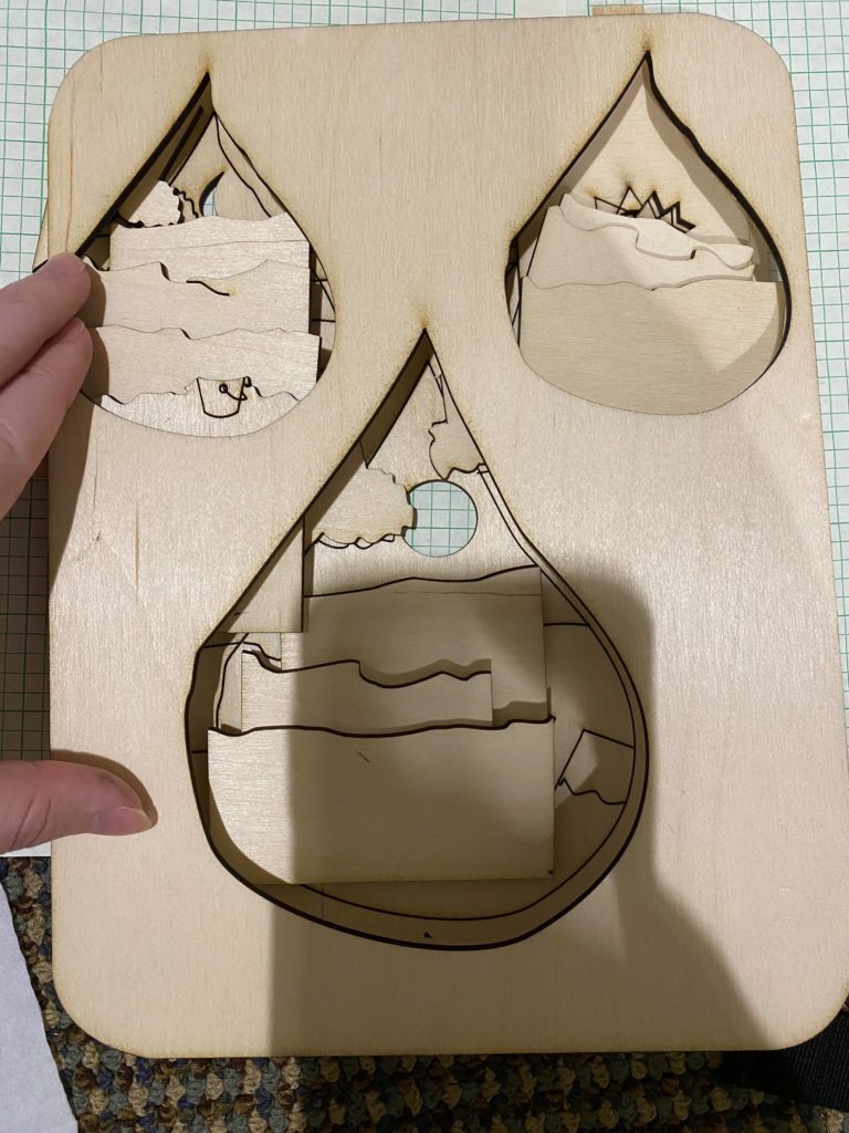 Cutting out the design showed me what I needed to adjust in the design so pieces that aren’t meant to be cut out don’t end up that way (the top of the bucket and the sun setting). Additionally, I think before going into final versions more testing of cuts is needed because I consistently had the problem where after my test and actually cutting the piece, sections of pieces wouldn’t be cut all the way through or pieces that weren’t meant to be cut out could be pushed out with a little force. I also made an issue for myself that can be seen in the photo that shows all my layers on top of each other that I cut the layers in a way that was saving material space and in way that I thought would cover the needed space and they didn’t. So between my final version and this version I will probably try to get another test in with the revised layer shapes so that sections aren’t missing.