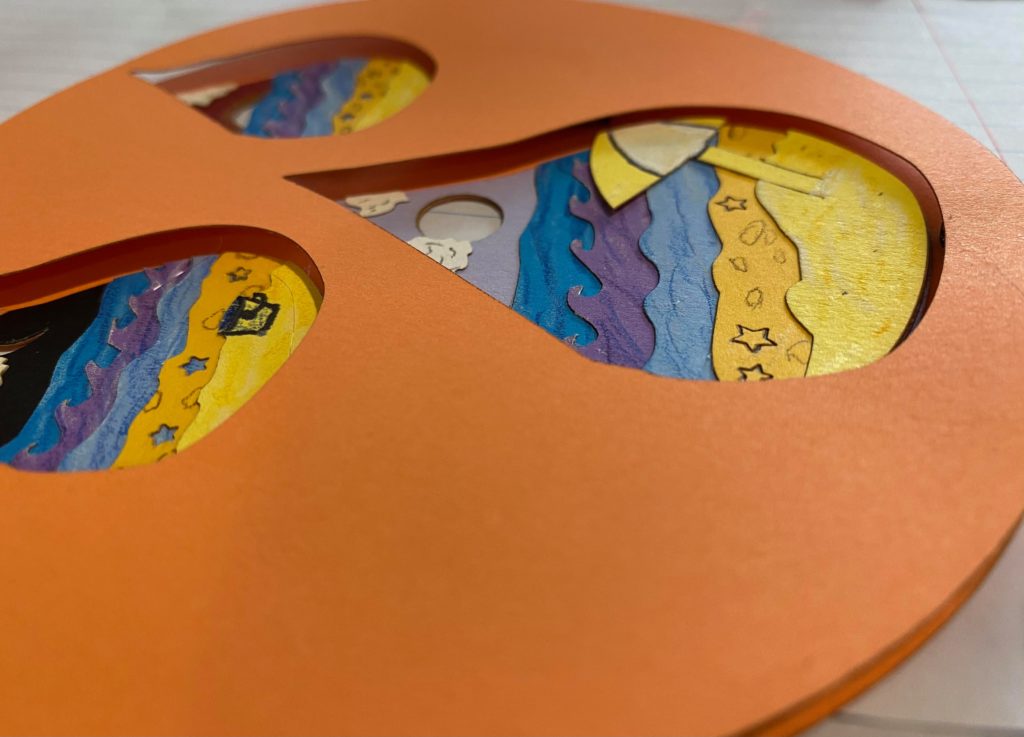 The bold colors have made your beach scene so happy and inviting. I appreciate how you are rethinking the final display of your project. How big do you think you’re going to make this final shell of layers? In my opinion I love seeing that some vector engraves worked and your are leaving them, and I actually really like how some are cut while some aren’t. There is something really cool about being able to see the blue water through the stars cut out of the beach layers.