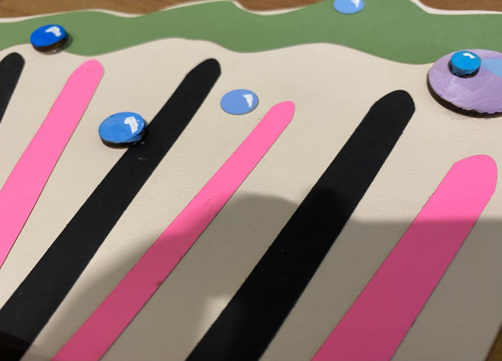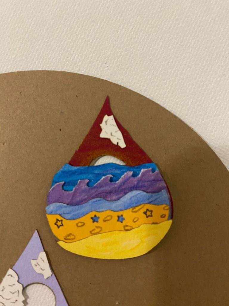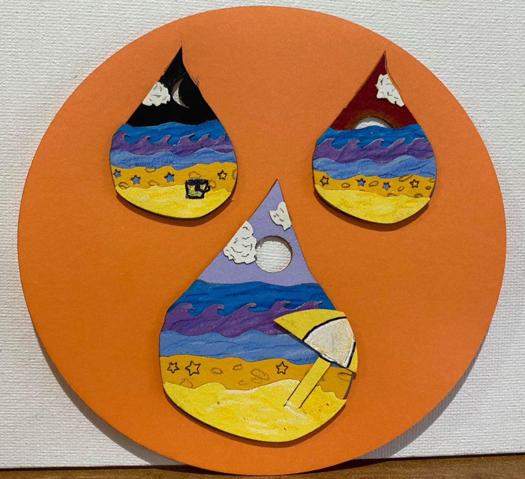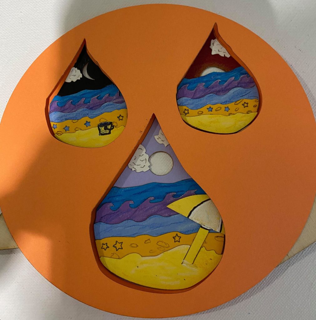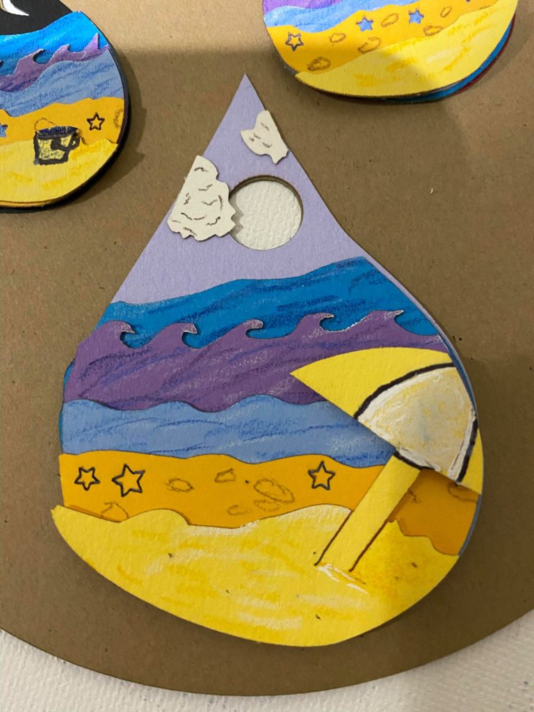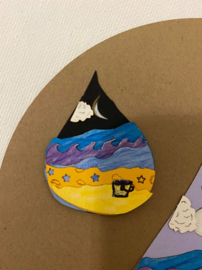 Hi! So for the background layers I tried to think of what the time of the day would be and what an interesting color for that might be. For the large raindrop I didn’t want to repeat using one of the blues from the ocean in the sky but also wanted it to be near that – which resulted in the light purple which is a color I liked and wanted to use in the piece somehow. As for the two smaller drops, the sunset raindrop was trying to take a color that might appear in a sunset and then use colored pencil to help it be the sun fading in the sky. As for the moon one, it almost ended up being the same color as the sunset raindrop, just to see how it would look if the smaller pieces pieces had identical backgrounds, but I preferred that each raindrop had their own time of day/background color so I went back to the black background.