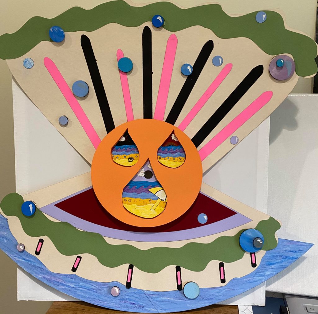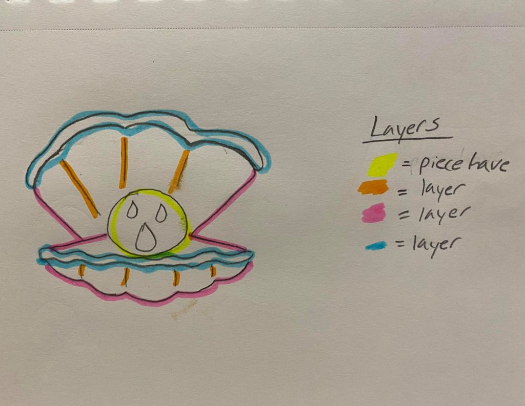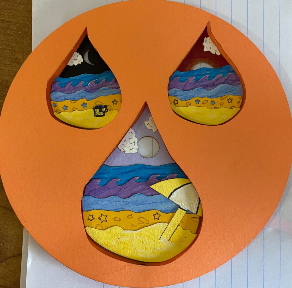 (4/12/21) As of right now, for my initial design the only thing I need to do is add the top layer over the raindrops to case it in. I planned to do this by using scrap pieces of wood from previous cuts and hot gluing them between the base layer and top layer. However, the scraps that I had are slightly bigger than the dimensions of the circle of the piece but when I go to cut additional pieces this week I will cut the sizes I need and do so. Which brings me to the next part of my piece. I thought about the piece and wanted to add more to the overall shape of the piece because I changed it to be a circle which I liked more than what I initially had but wasn’t entirely thinking that was the final shape. Because of that I thought it might be interesting to have the circle piece I have now become a pearl in an oyster or clam because in the raindrops are beach scenes. So I’m going to add additional layers to the piece in the overall background of the piece. The plans for that are in a photo below. Additionally while starting to cut the layers for the piece I wasn’t sure what the background of each of the raindrops should be or what the overall top layer of the piece should be. As a result, I tried 2 different top layers and tried the background of the raindrops being all different and then the 2 smaller ones being the same before deciding they should all be different. I also added some small details with pen and colored pencils on the different layers. A thing I learned while using the laser on the cardstock is that the material can only be cut and vector engraves won’t work. I had tried the laser at 0.1% and other numbers before 0.2% (which cuts the piece) and nothing appeared. I was able to have some of the stars stay in the piece even though they were technically cut because I had them on the 0.2% which cuts, but it cuts in a way where the parts will stay for the most part unless pushed.