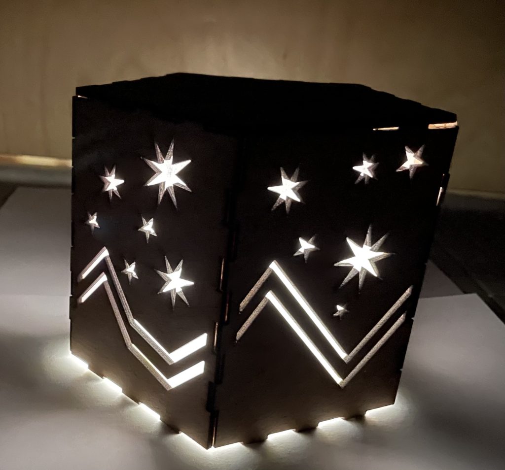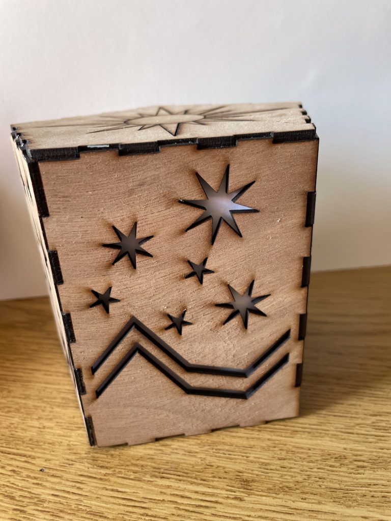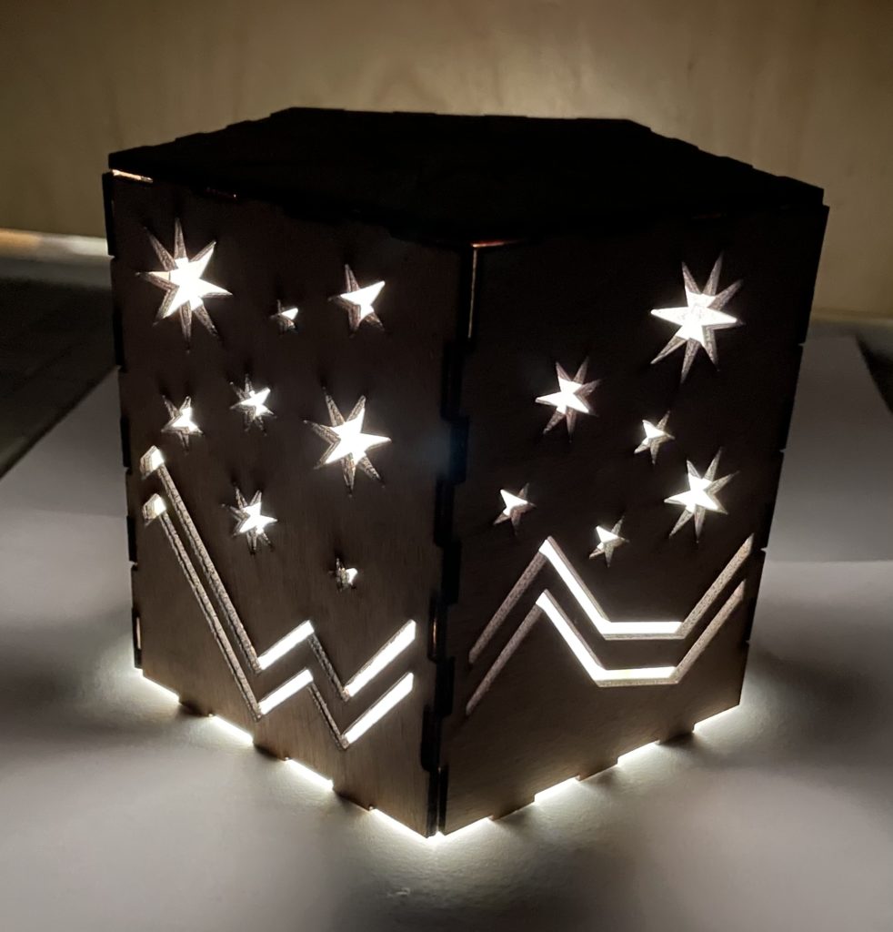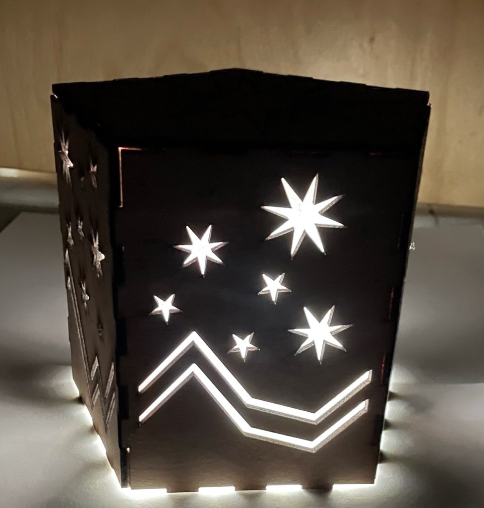 Lantern Project: For this project I started with the box maker website and determined I really liked the look of the pentagon shape for a lantern. Then I began thinking about the design and knew I wanted something that would wrap entirely around the lantern, this led to me wanting to do a horizon line of mountains. The mountains went through various redesigns until I got to the dual horizon line I used in the final design. I also added many stars to be the main point of where light is being used in the design. The light is on the interior, mounted to the top of the box.