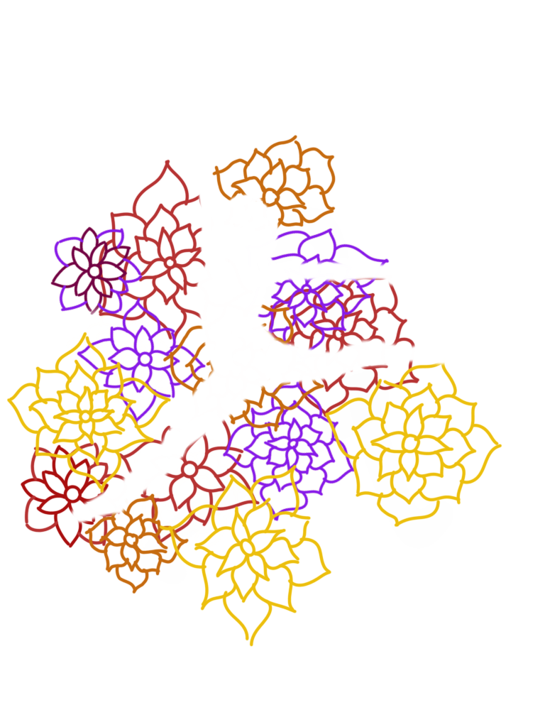 The artists that inspired this design was Jen Stark for the concept of layering different colors and shapes that come together when viewed from different angles. In my piece I am planning to have the different colored flowers above the previous color so the image of my silhouette only comes out when viewing the piece so all the layers line up. Additionally I really liked the floral and cutout designs of Ibbini so in drawing my cut outs vs engraves I want to take inspiration from their designs.