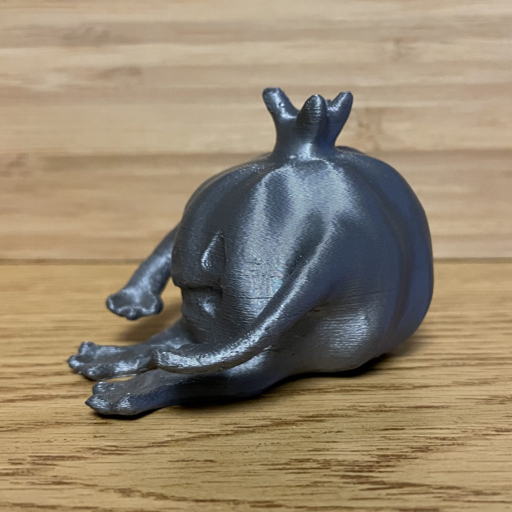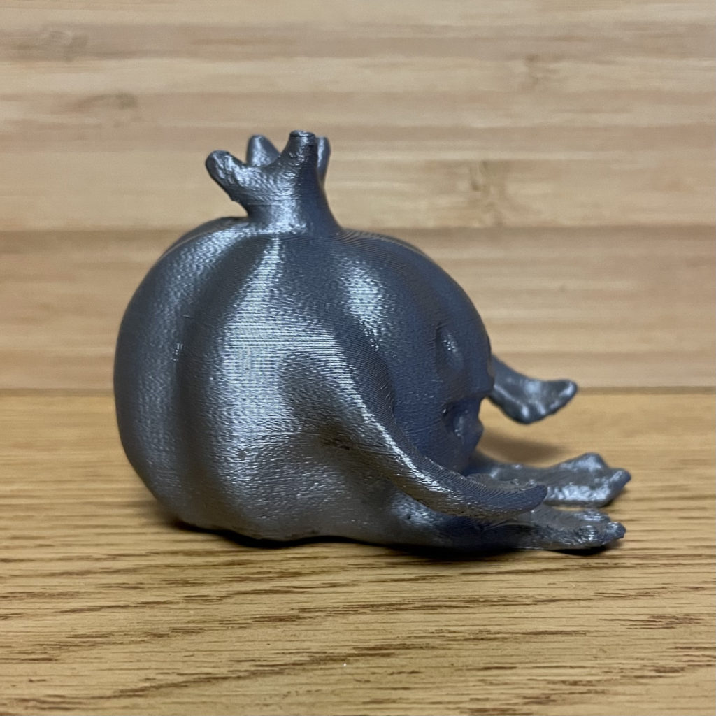 For the project I used Zbrush core mini to design a desk friend to hold my pen. The toy I used as inspiration was a pumpkin beanie baby with funny frog like arms and legs. I had gotten this toy for Halloween when I was maybe 6 years old and lost it not long after. This is not only a replacement for my lost Plumpkin the Pumpkin friend but a cute 3D printed version that has been given a functional purpose. This project two my two tries because my first print accidently ended up with a spaghetti arm. The second print came out perfect, just a little smaller to take up less room on my desk. And it should be noted that they both hold a pen just how I wanted! The color is the silver PLA filament, I thought about painting him but decided against it because I just love the shininess and simplicity from the silver.