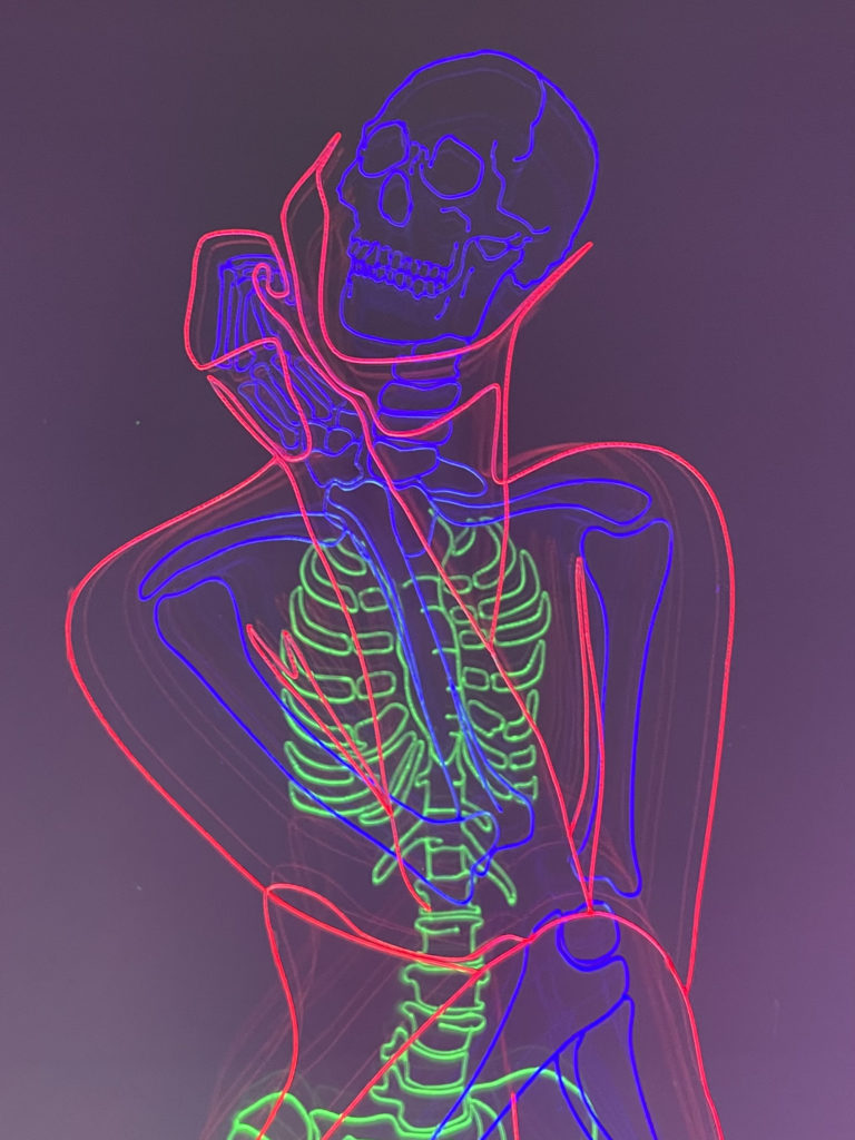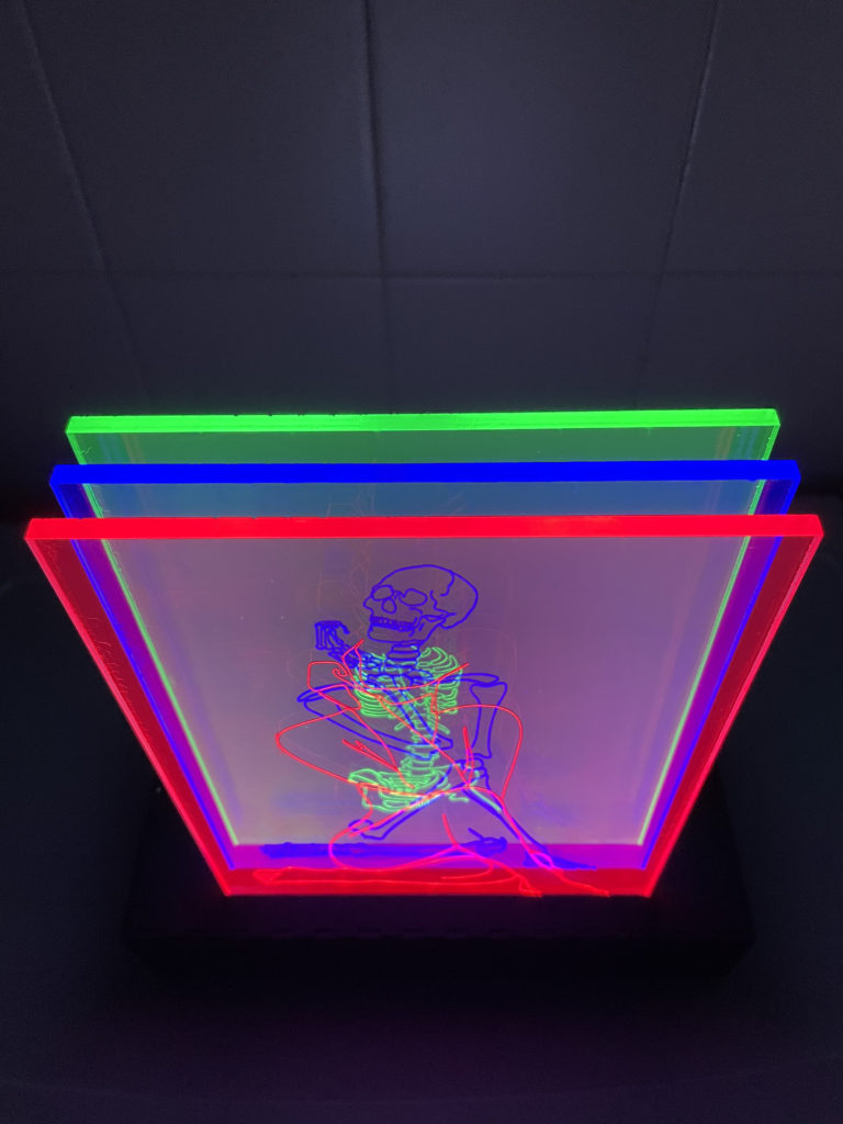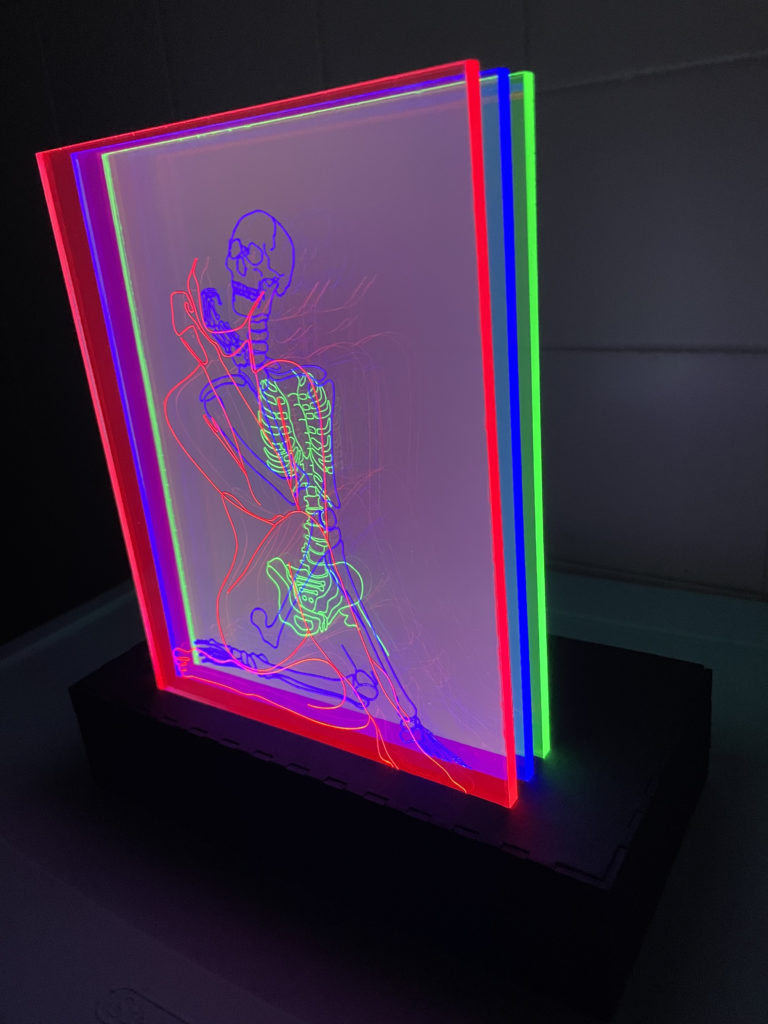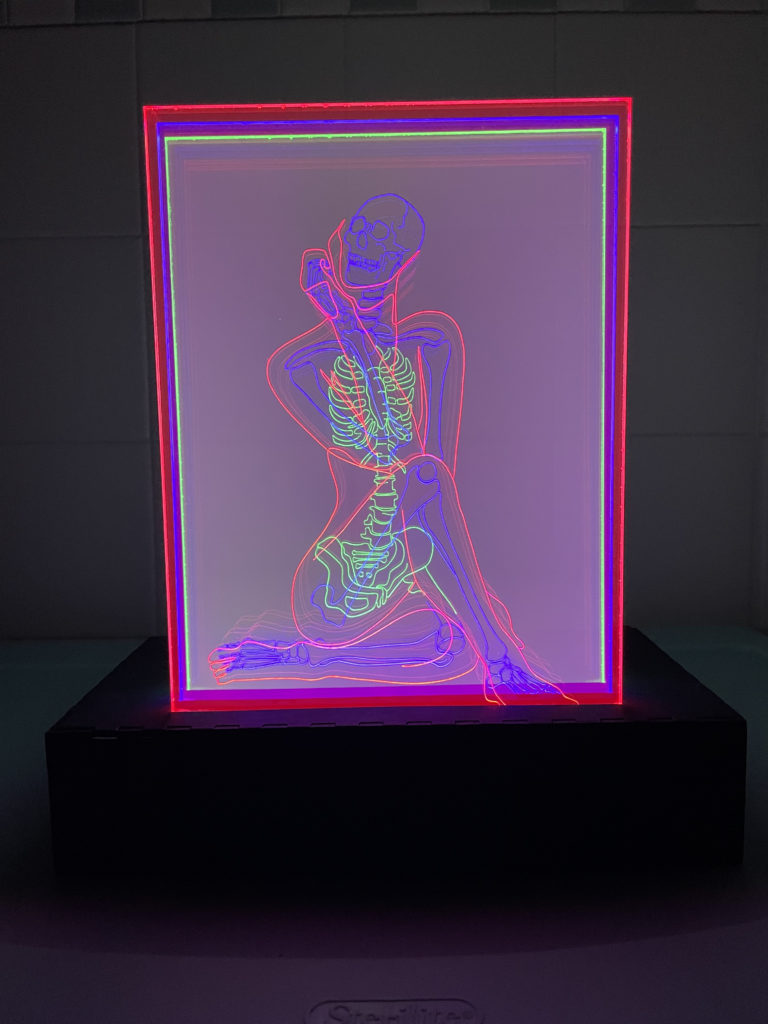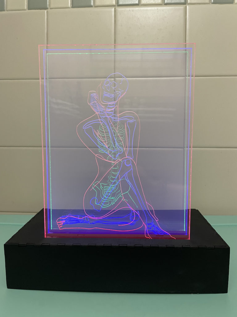 For my lantern project I vector engraved the figure and skeleton of a female figure onto three clear acrylic sheets to be edge lit with LED strips. I have spent a lot of time studying the human figure in art classes and also have had a fascination for the human skeleton for a long time, so to be able to combine these two areas into a single 3D artistic project was a dream. I knew I wanted to try edge lit acrylic for this project as soon as I realized it was a possibility. I remember it was maybe 5 years ago when I first saw a piece of acrylic laser cut and engraved like a lampshade being lit by LED lights, I was blown away by the possibilities of this concept and have been obsessed ever since. For dimensions I have 3 sheets of 1/4″ Lucite Light Guide Acrylic cut to be 7×11″. The display box is a 10x5x2″ box made of 1/8″ plywood painted with black acrylic. I used boxes.py to design the UniversalBox with the correct kerf measurements before sending the designs to Inkscape were I altered the design to add the slits in the top for the acrylic sheets to fit int, the sliding back panel to access the LED battery packs, and design dividers to keep the three colors of lights from bleeding into each other. The lights I used were 3 separate 12″ stips of red, blue, and green LED lights that each have their own battery pack.