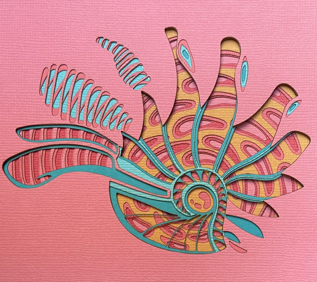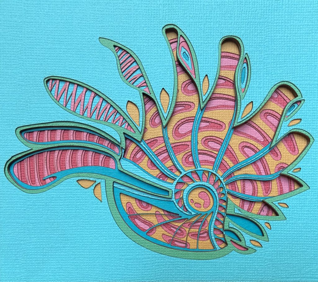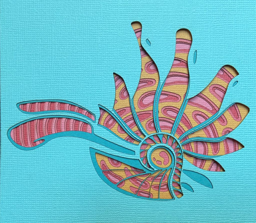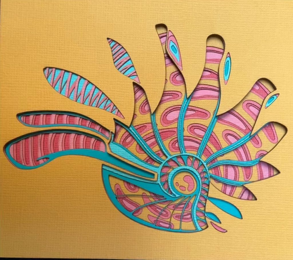 For this piece I was inspired by an artist named Hazel Glass, who creates beautiful artwork made of layers of paper. My design was based on a conch shell and then expanded on with patterns and random designs. Creating the layers of this piece was easy, building from the bottom up over a sketch that I had drawn prior. The best part of this piece was watching each different coloured paper being lasercut, placing that cut paper onto the prior one, and watching them slowly build into the final piece.