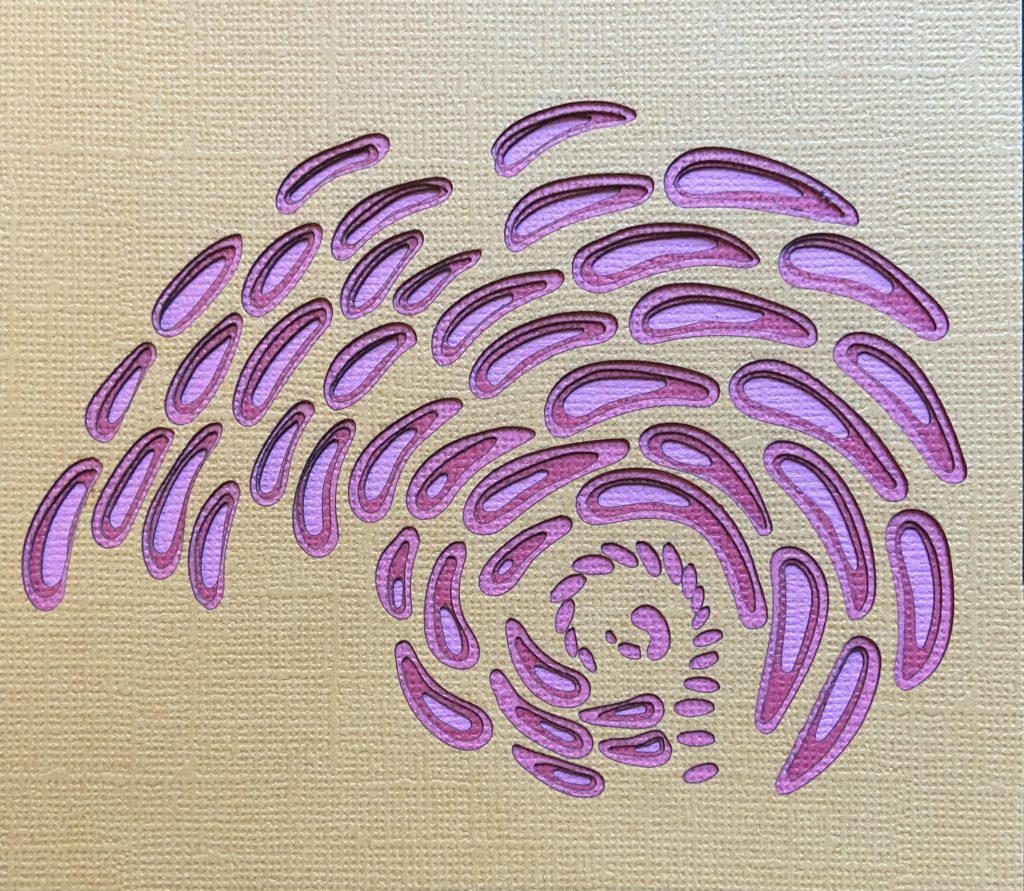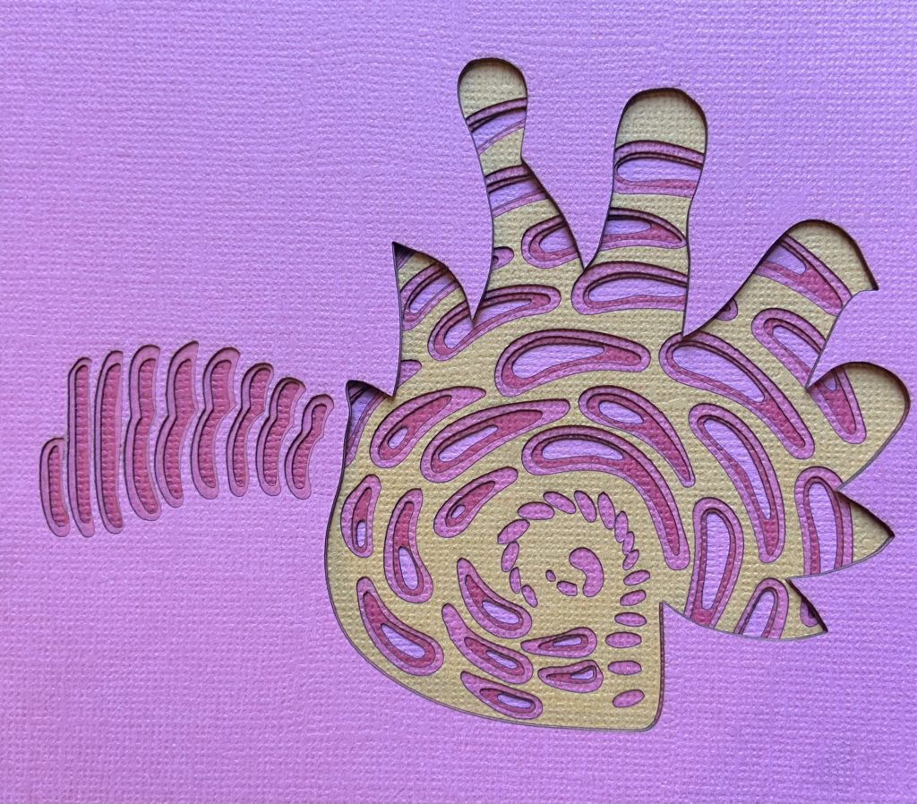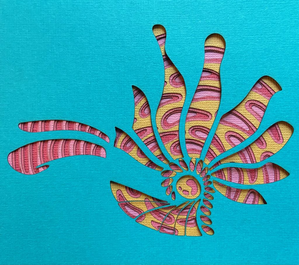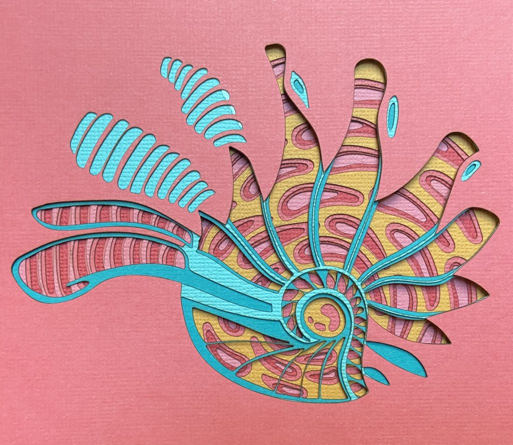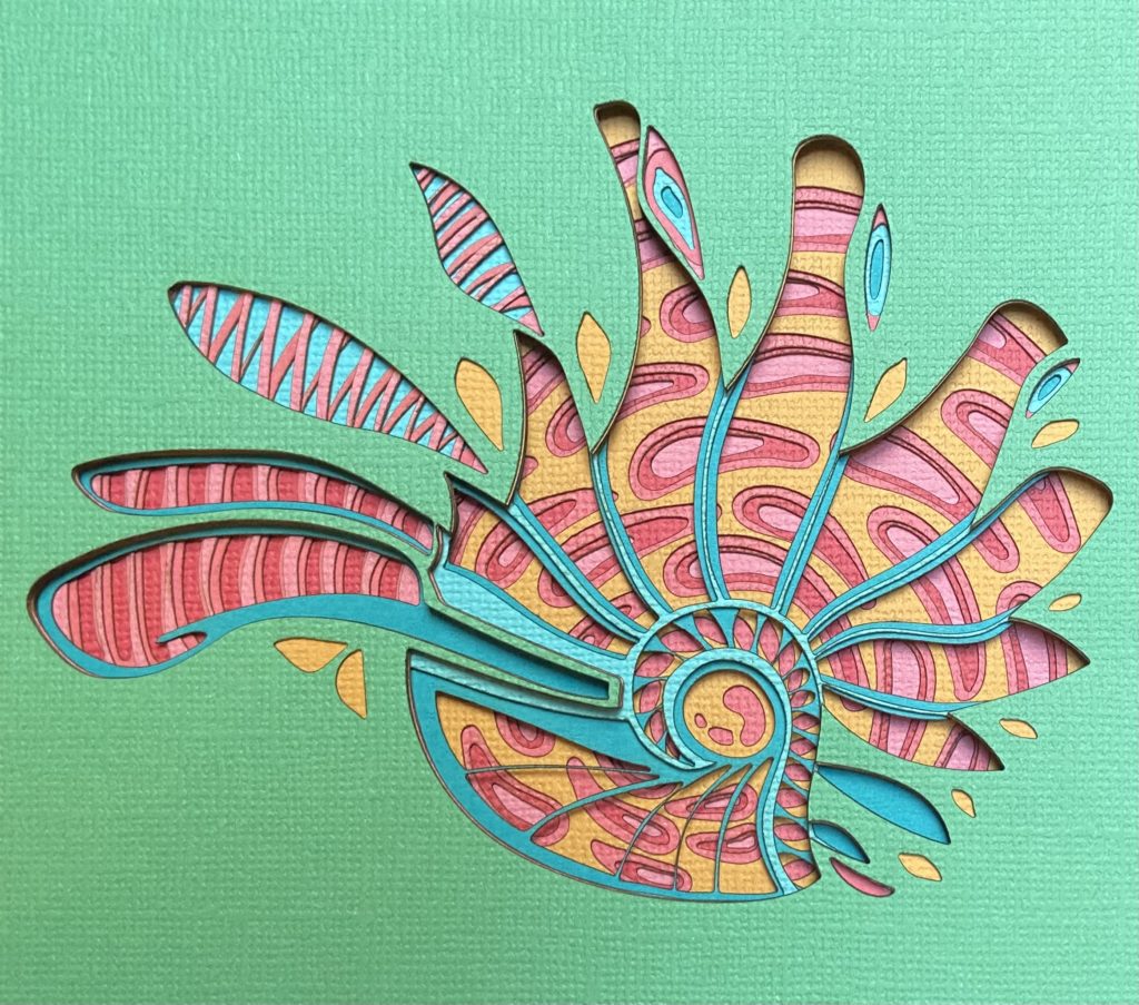 For this piece I was inspired by an artist named Hazel Glass, who creates beautiful artwork made of layers of paper. My design was based on a conch shell and then expanded on with patterns and random designs. Creating the layers of this piece was easy, building from the bottom up over a sketch that I had drawn prior. The best part of this piece was watching each different coloured paper being lasercut, placing that cut paper onto the prior one, and watching them slowly build into the final piece.