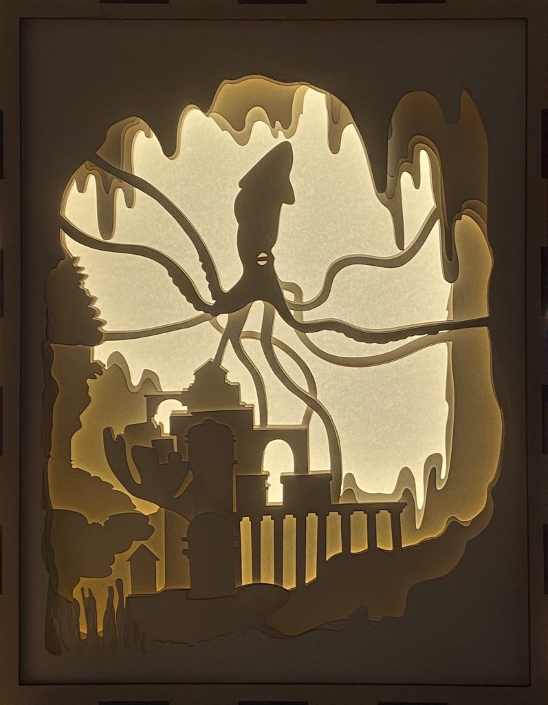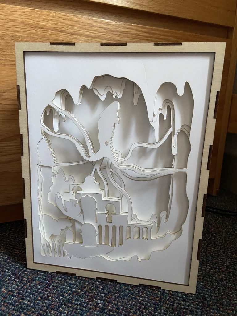 For this project, I was heavily influenced by the artistic duo Hari and Deepti and more specifically a deep-sea depiction of a Jules Verne’s classic “The Twenty Thousand Leagues Under the Sea.” Similarly inspired by the ocean, I created a piece focused on the lost city of Atlantis being overseen by a giant squid. I had more trouble creating the layers of this piece than the ‘layers project’ piece, as I had to incorporate how the light would shine through. I had to take into consideration how many layers are needed for the light and dark that I wanted, so some needed to be a single piece while others needed a few layers. This method of working backwards really put my brain to the test, but I’m very happy with the results.