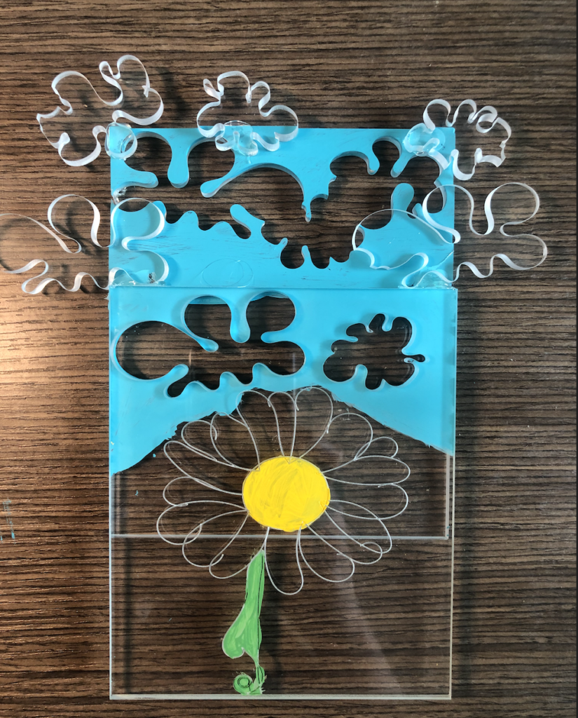 Spring inspired. 2 layers of clouds and then cloud cut-outs at the top of the 1st layer. Engraved flower on 1st layer.